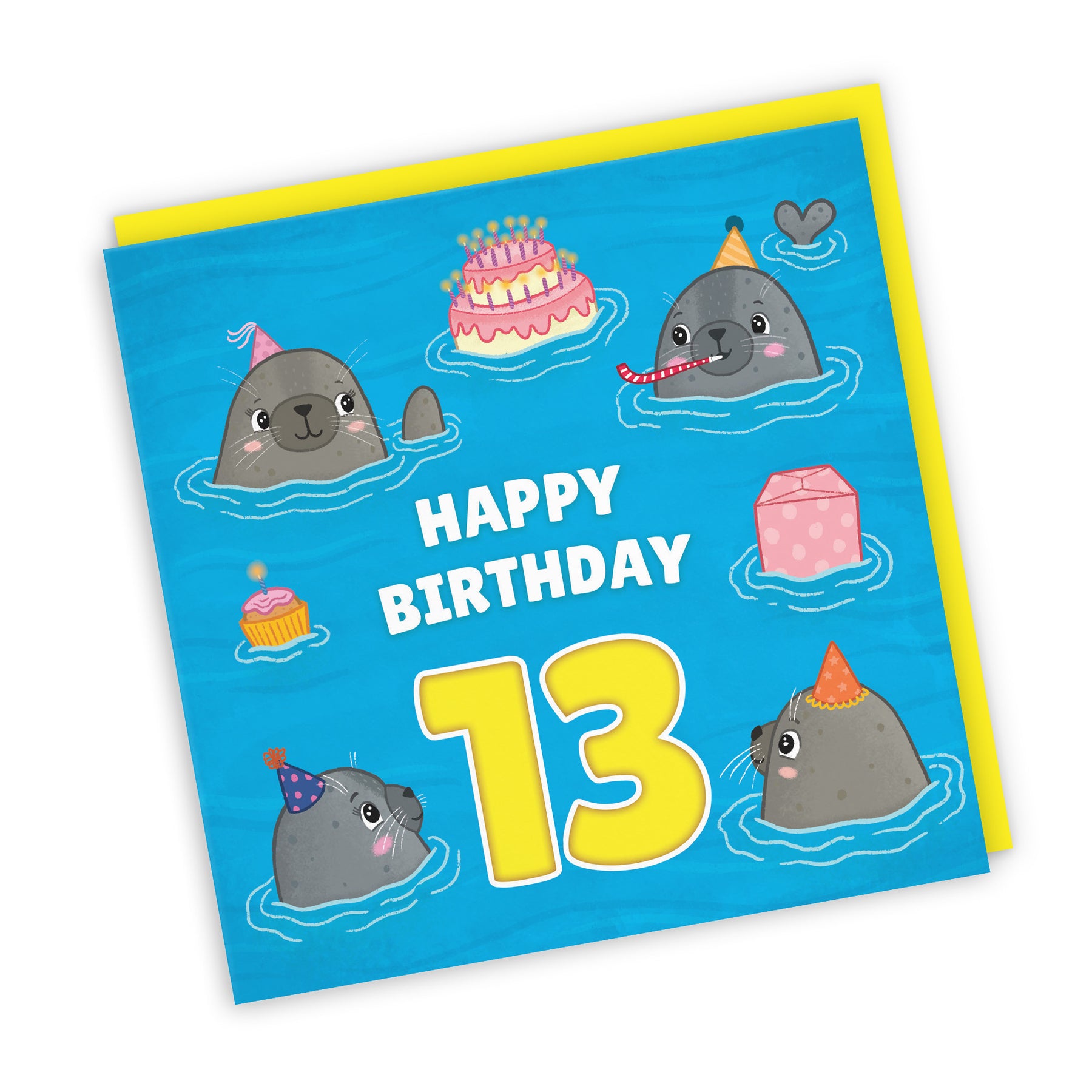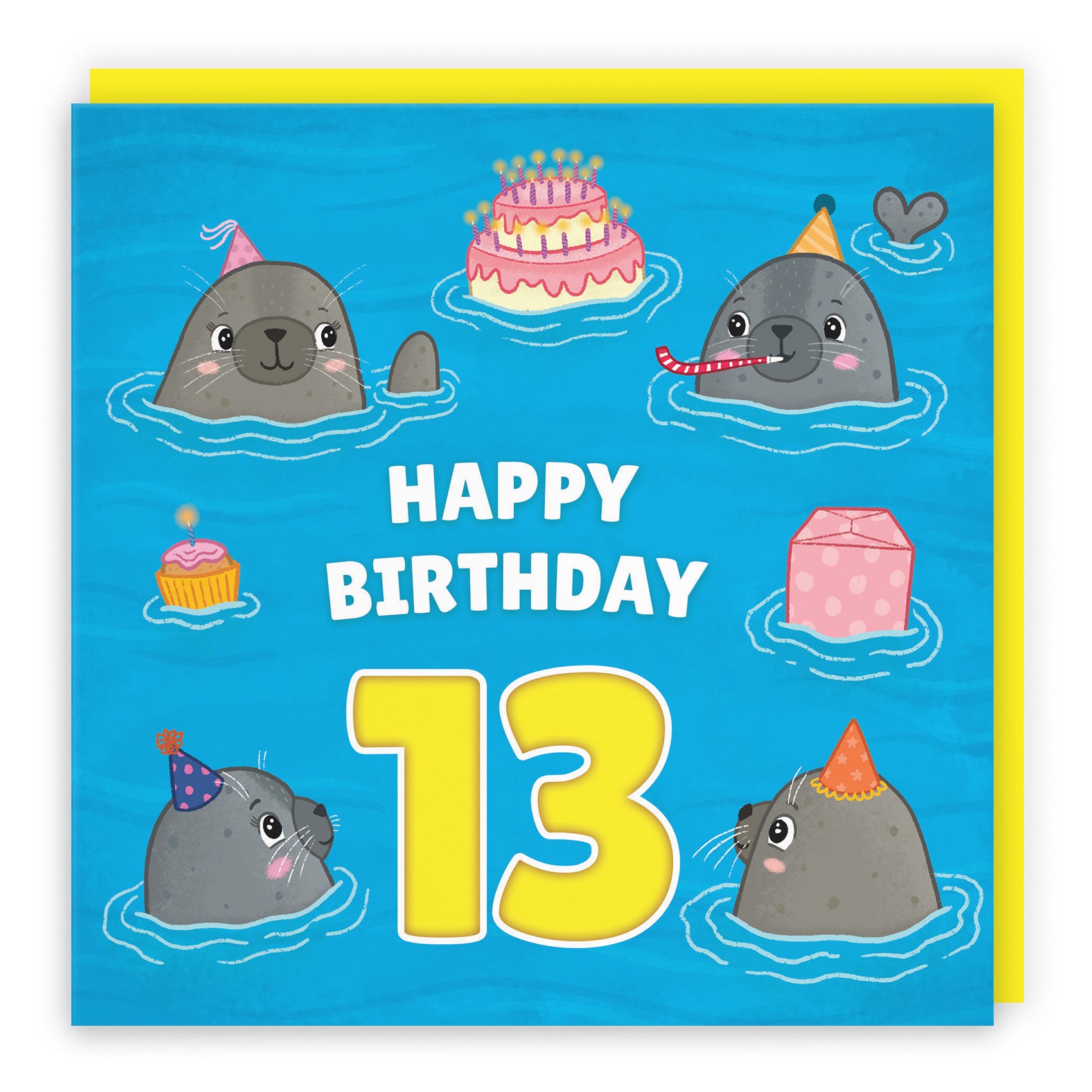 Hunts England - Cute Seals Boys / Girls 13th Birthday Card - Happy Birthday - 13 - Children's / Kids Card - Seals At A Party - Ocean Collection.