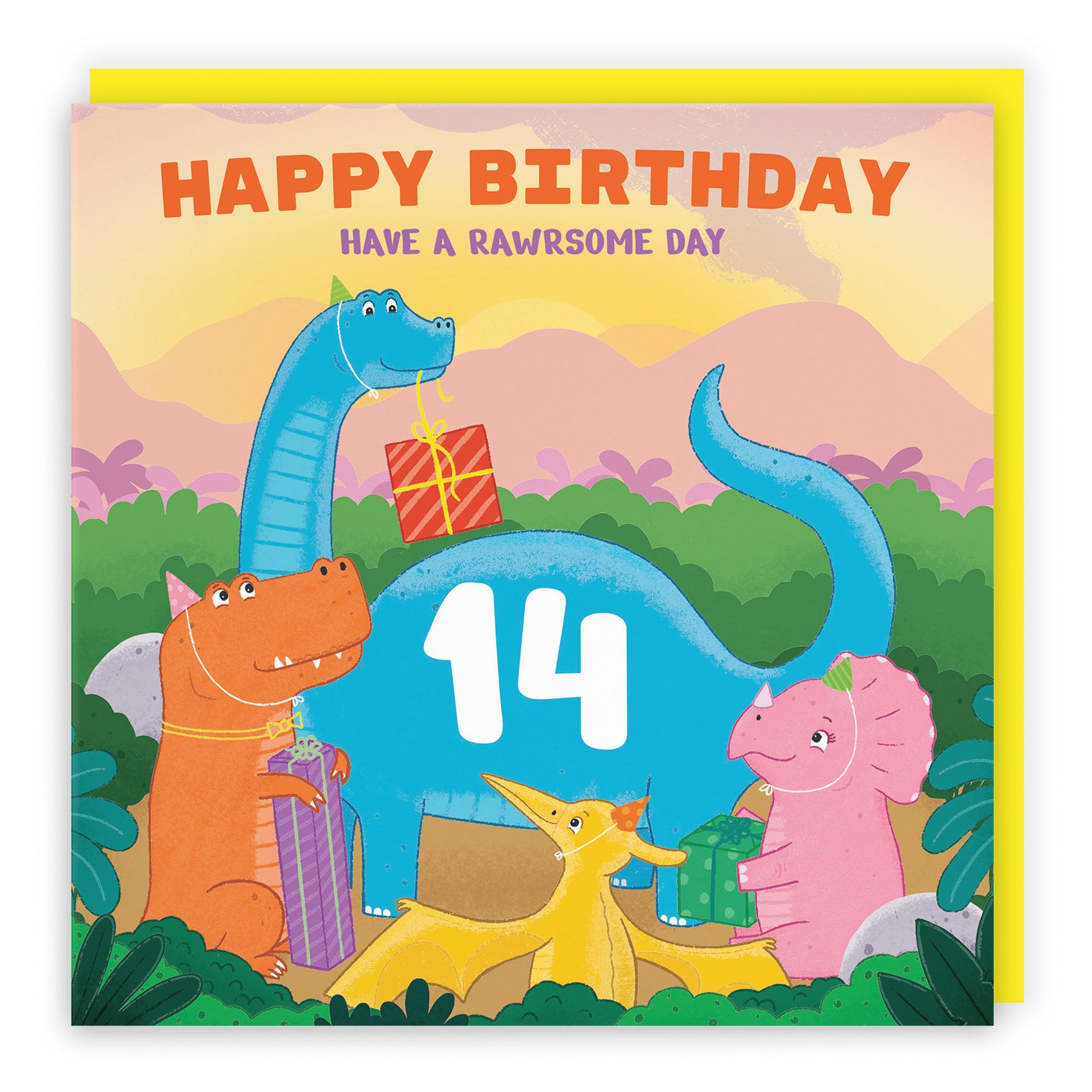 Hunts England - 14th Birthday Boys / Girls Dinosaur Party Card - Happy Birthday - Have A Rawrsome Day - 14 - Age 14 - Imagination Collection.