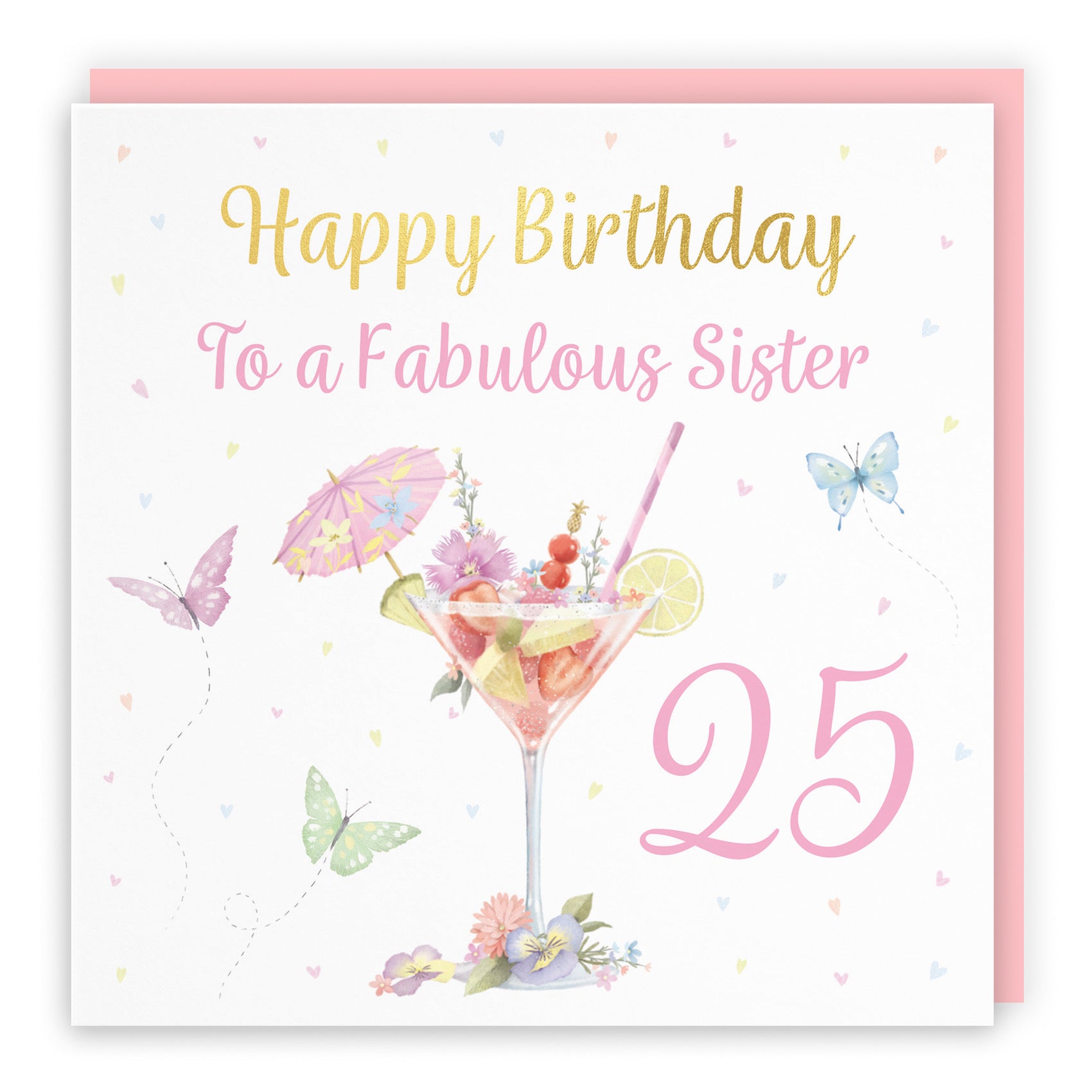 Hunts England - 25th Sister Pink Cocktail And Butterflies Birthday Card - Gold Foil - Milo's Gallery - Age 25 Drinks, Flowers, Hearts Birthday Card For Sister.