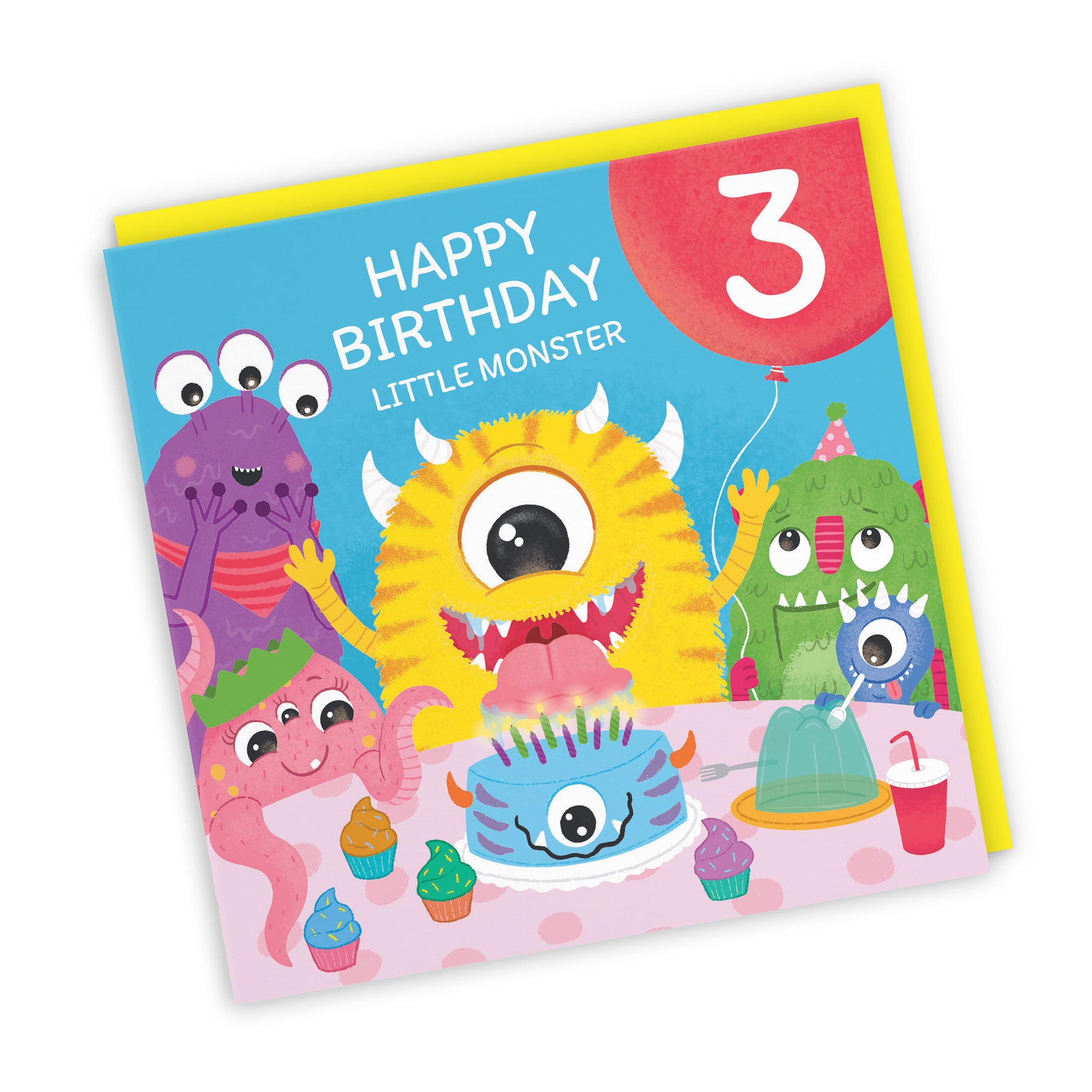 Hunts England - 3rd Birthday Boys / Girls Monsters Party Card - Happy Birthday - Little Monster - 3 - Age 3 - Imagination Collection.