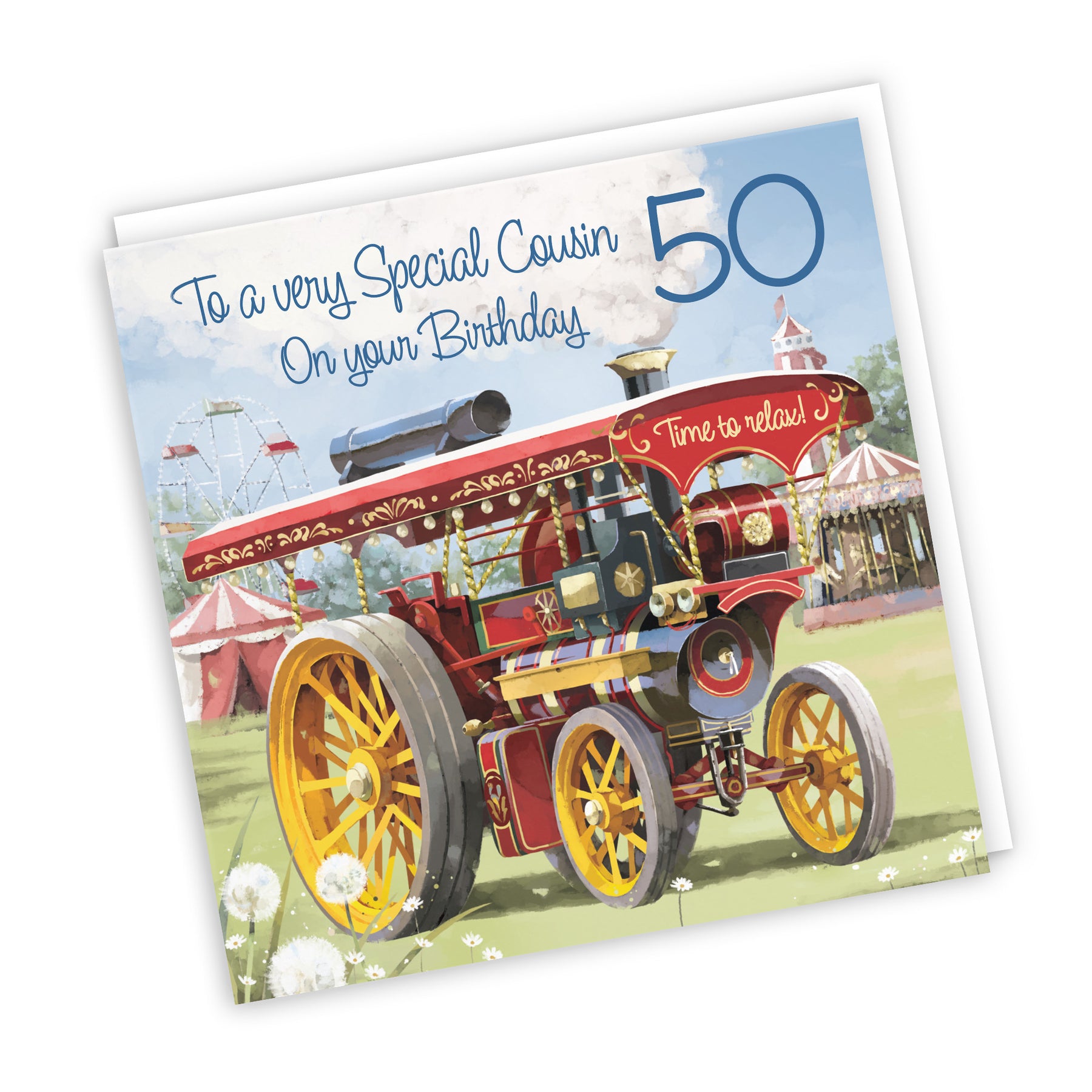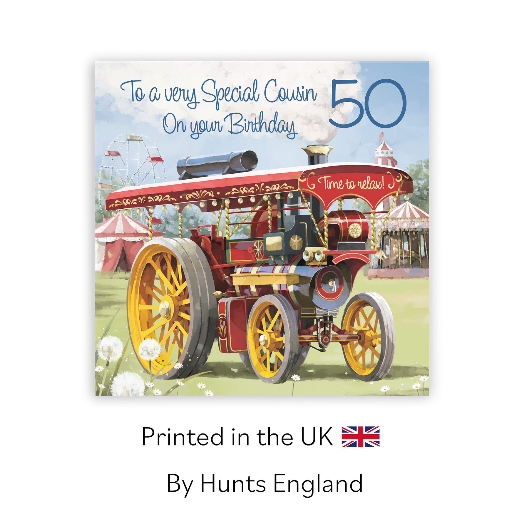 Hunts England - 50th Cousin Traction Engine Birthday Card - Age 50 Card For Cousin - Steam Tractor - Milo's Gallery - Age Fifty Birthday - 50 Year Old.
