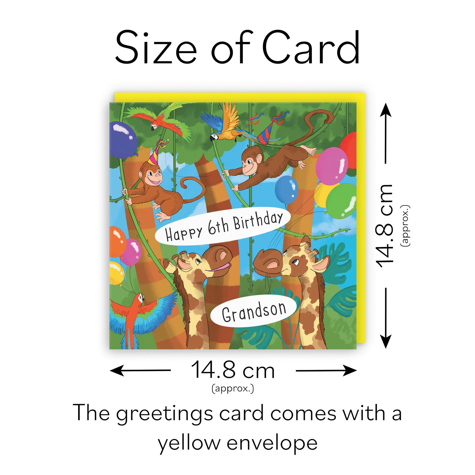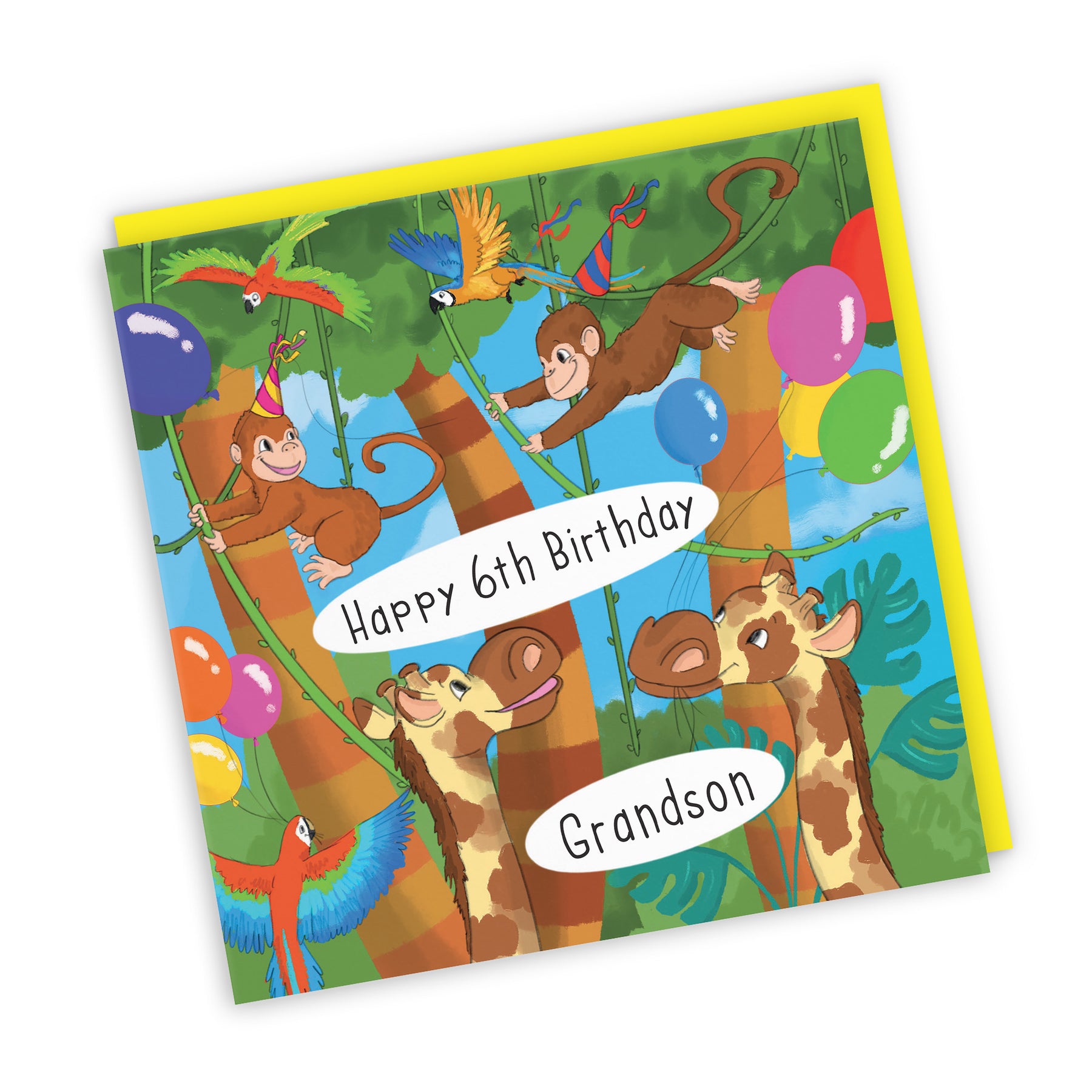 Hunts England - Grandson 6th Monkey Birthday Card - Happy 6th Birthday - Grandson - Monkeys, Giraffes & Parrots Kids Card - Jungle Collection.