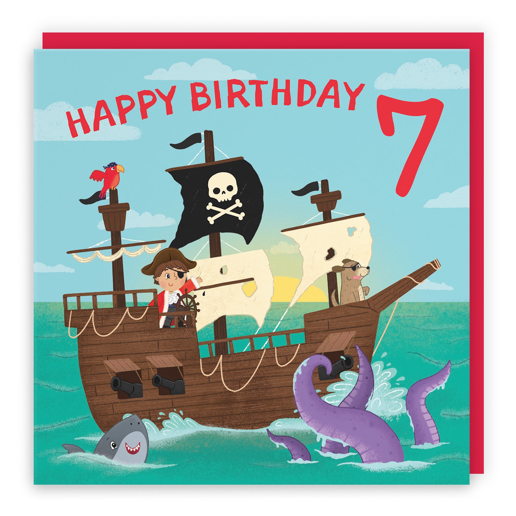 Hunts England - Boys Pirate Ship 7th Birthday Card - Happy Birthday Matey - 7 - Pirate Ship On High Seas - Age 7 - Imagination Collection.