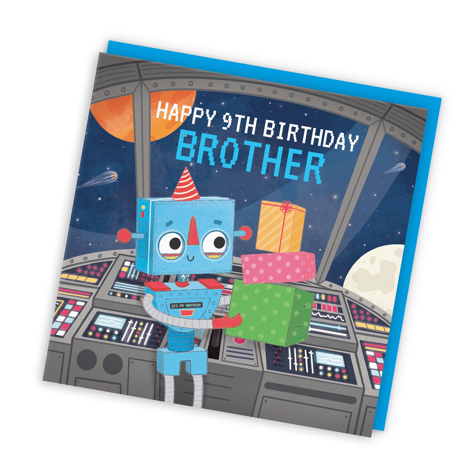 Hunts England - Brother 9th Space Robot Birthday Card - Happy 9th Birthday - Brother - Robot On A Spaceship - Children's / Kids Card - Imagination Collection.