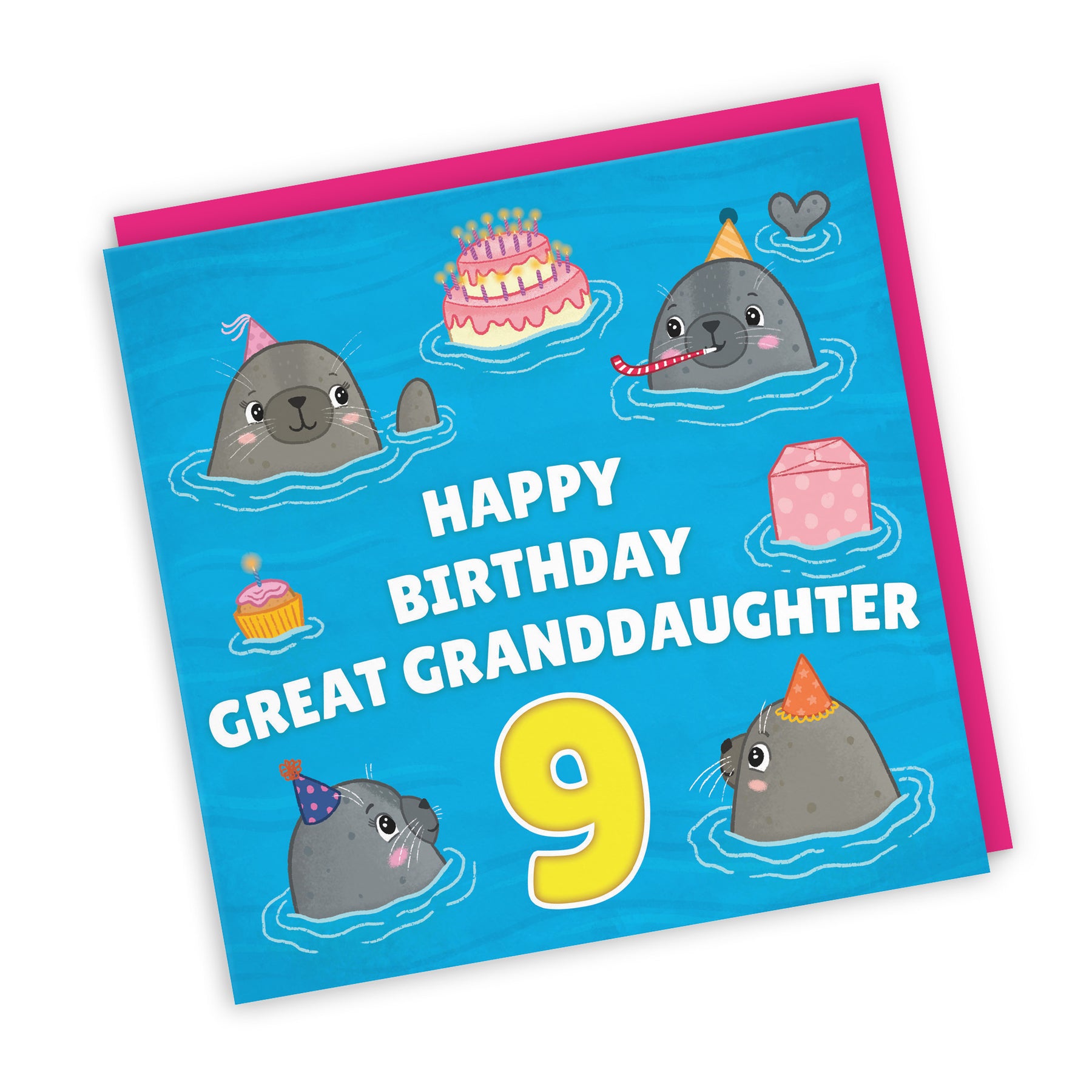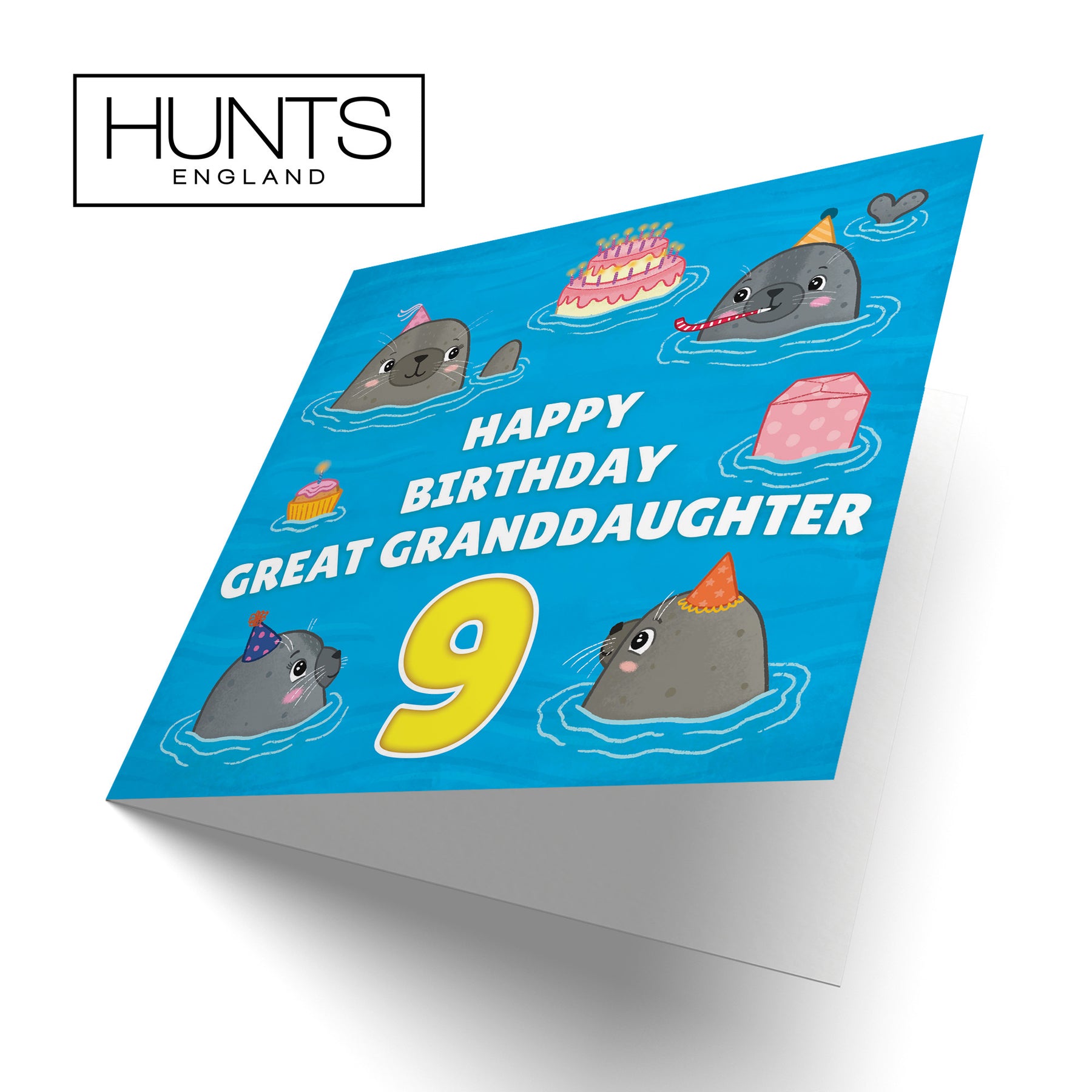 Hunts England - Great Granddaughter 9th Cute Seals Birthday Card - Happy Birthday - Great Granddaughter - 9 - Children's / Kids Card - Seals At A Party - Ocean Collection.