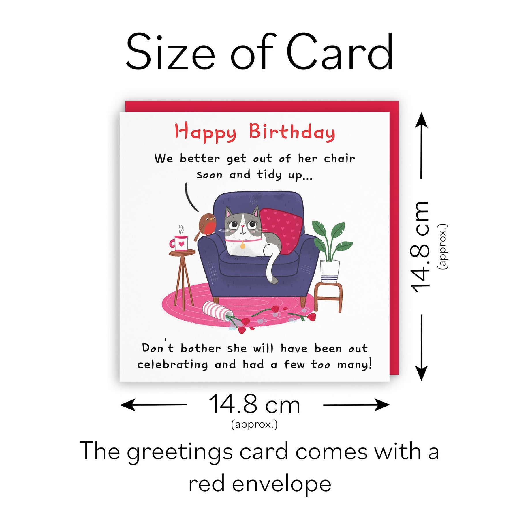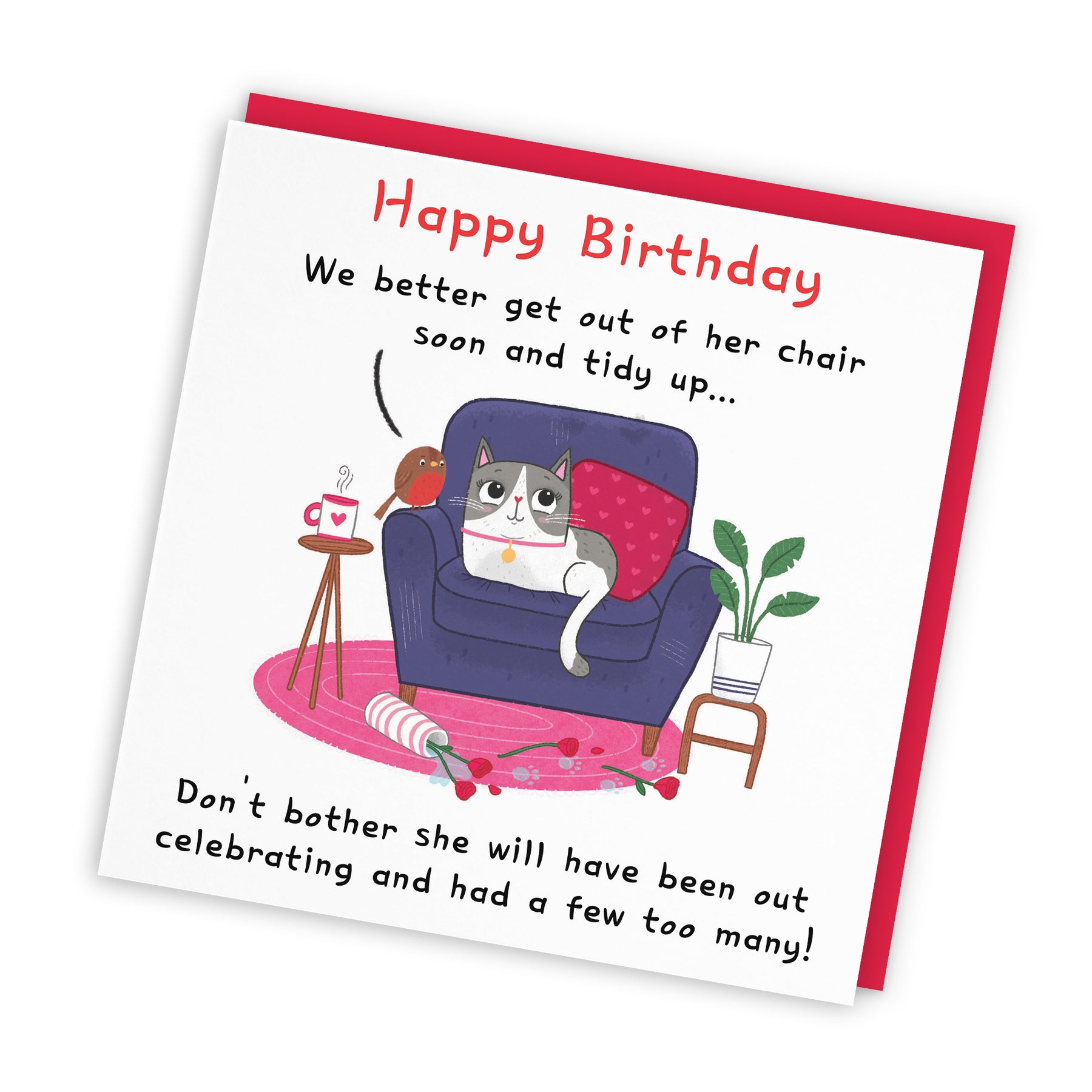 Hunts England - Funny Cat Birthday Card For Her - Happy Birthday - We Better Get Out Of Her Chair Soon And Tidy Up... - Card For Friend, Cousin, Sister, etc. - Iconic Collection.