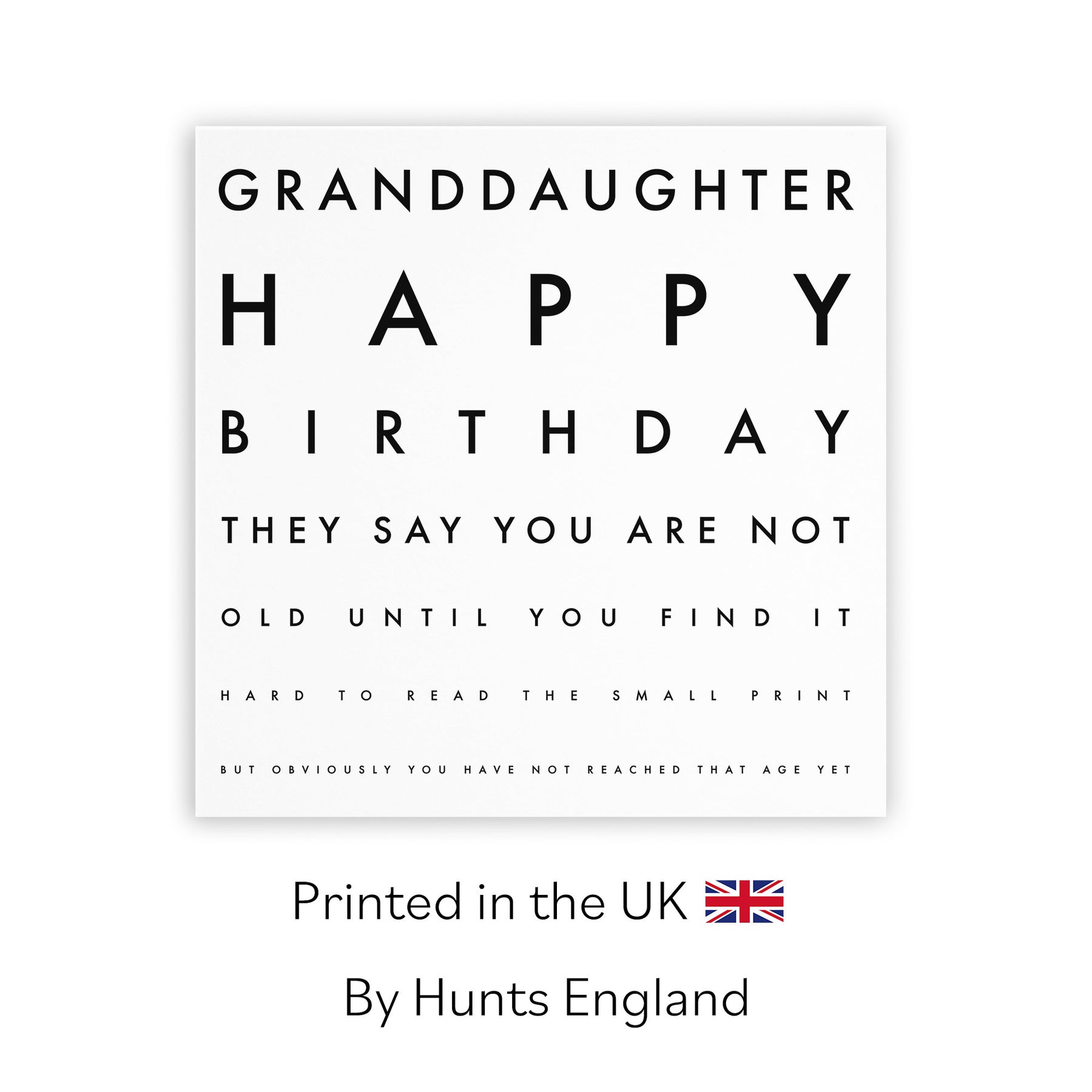 Hunts England - Granddaughter Humorous Joke Birthday Card - Granddaughter - Happy Birthday - They Say You Are Not Old Until You Find It Hard To Read The Small Print... - Letters Collection.