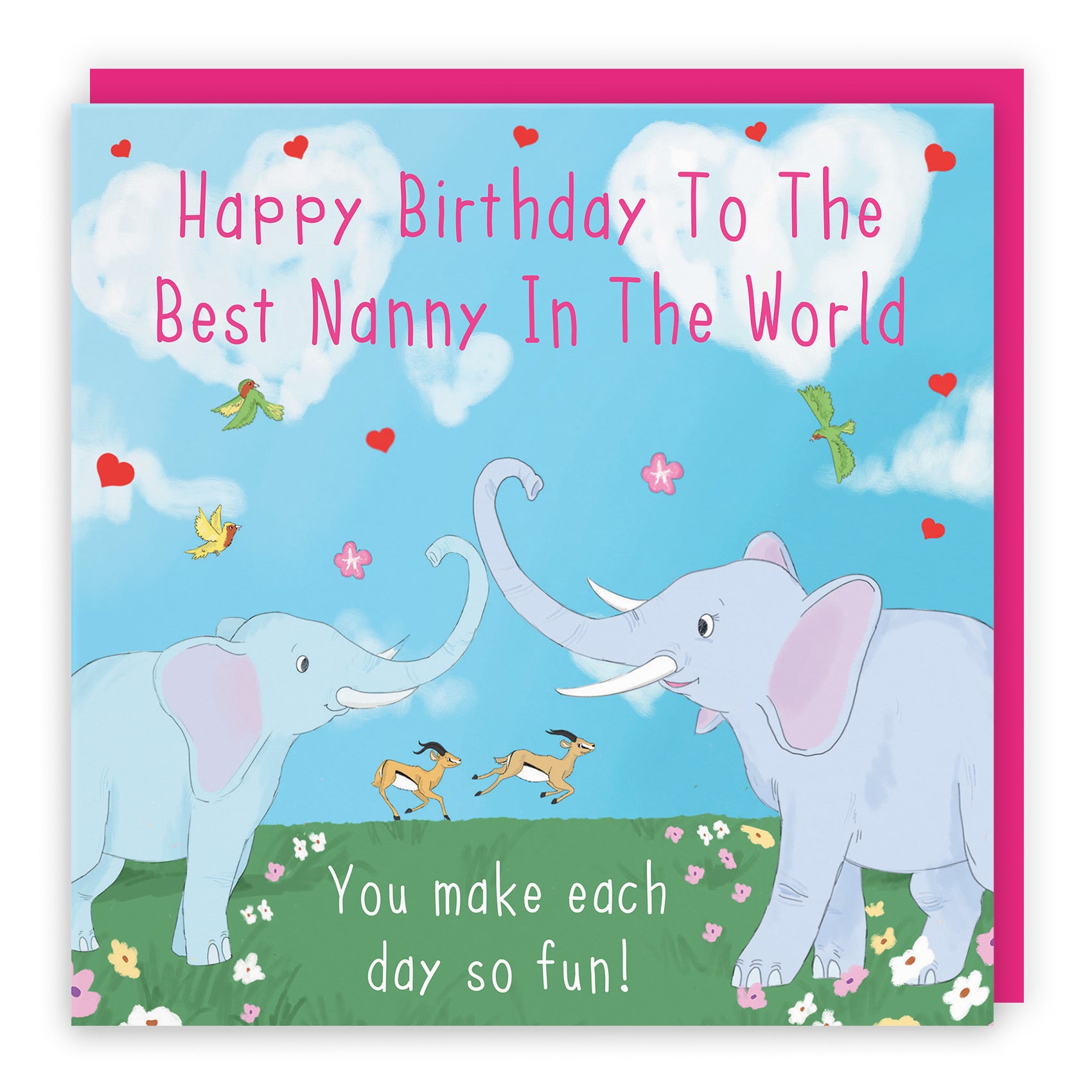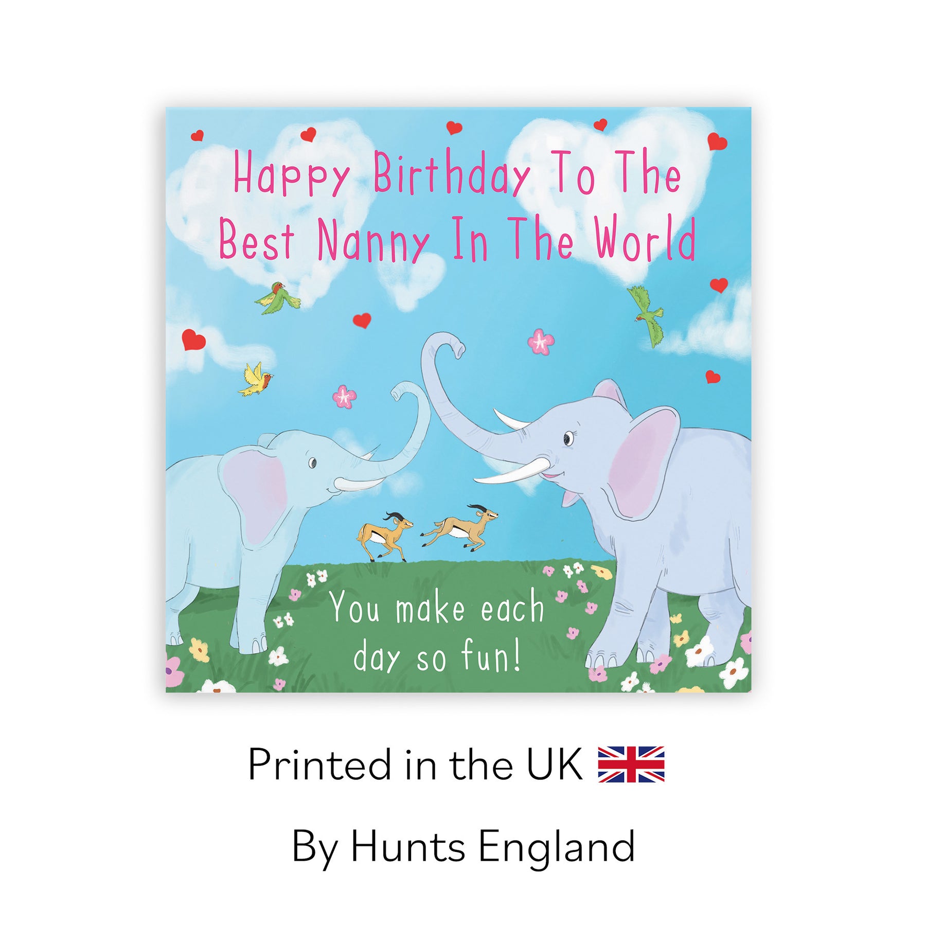 Hunts England - Nanny Cute Elephants Birthday Card - Happy Birthday To The Best Nanny In The World - You Make Each Day So Fun! - Card From Young Child - Cute Animals Collection.