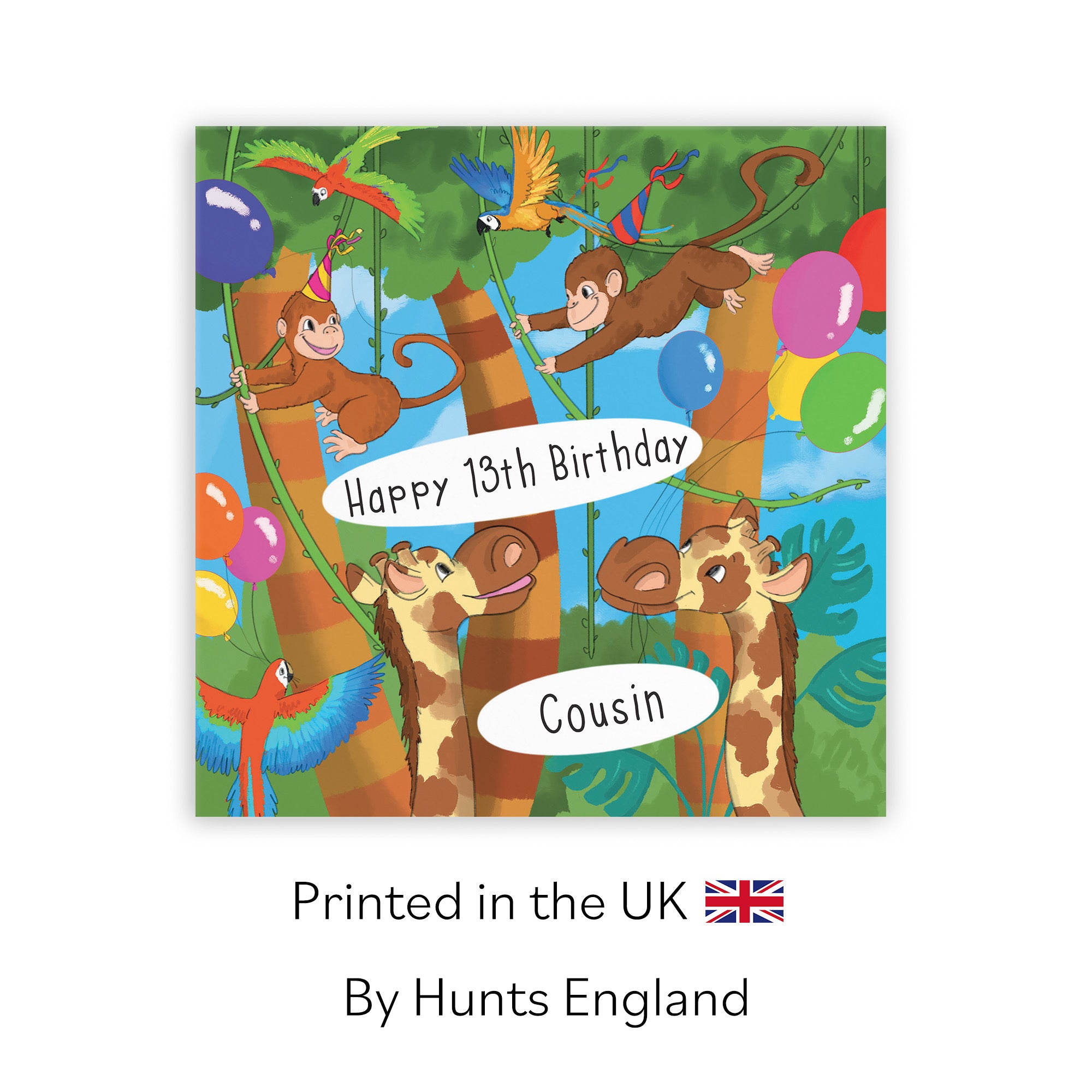 Hunts England - Cousin 13th Monkey Birthday Card - Happy 13th Birthday - Cousin - Monkeys, Giraffes & Parrots Kids Card - Jungle Collection.