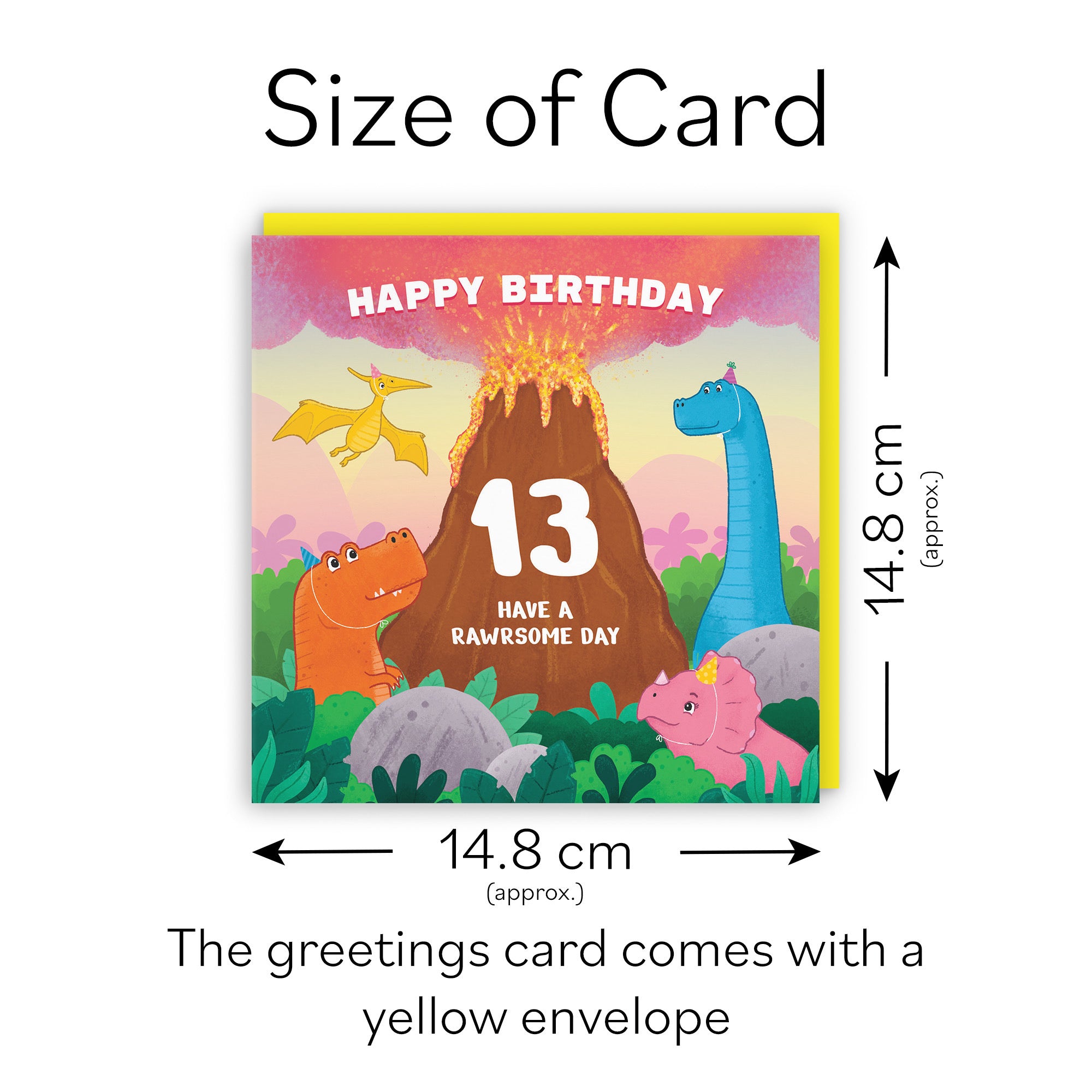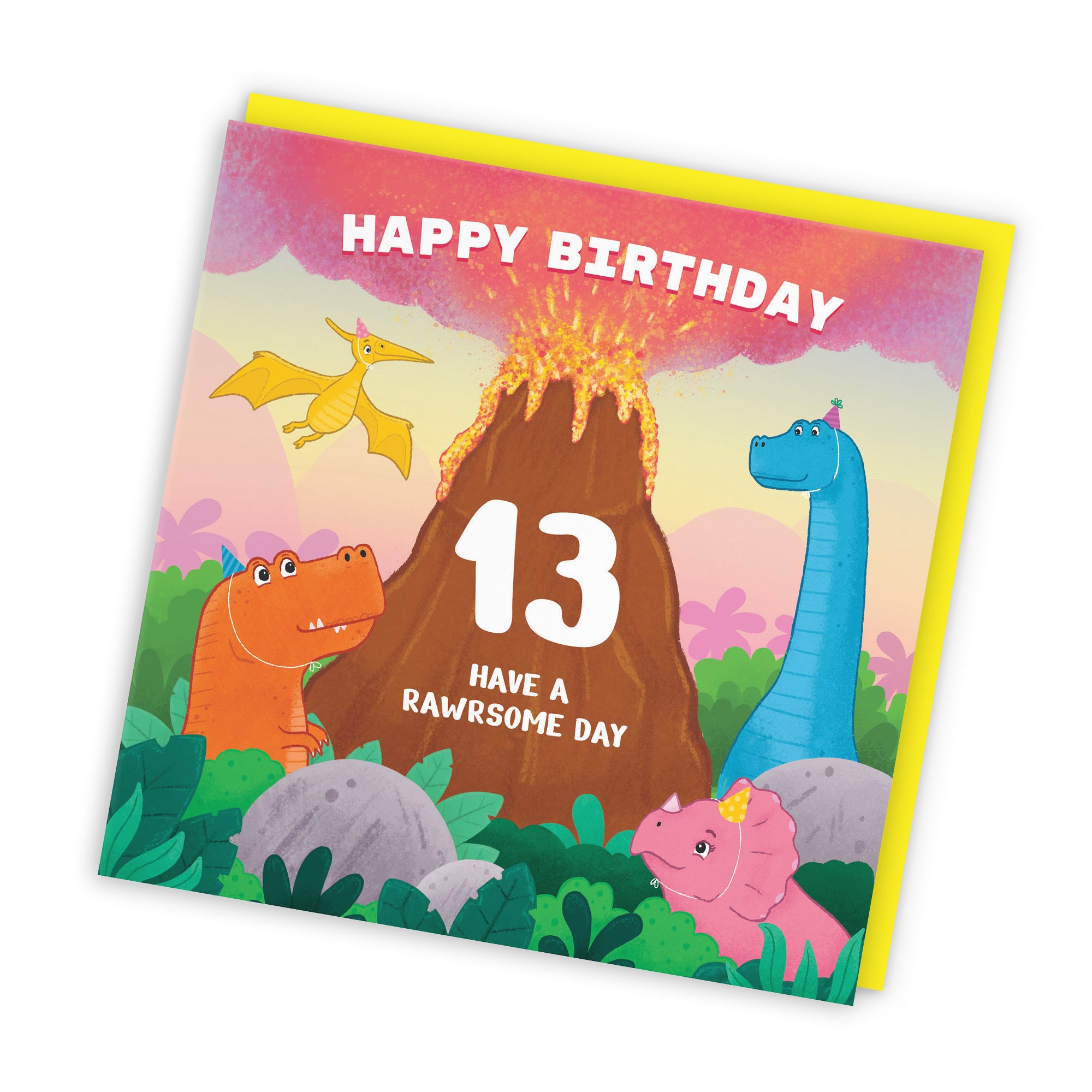 Hunts England - Boys / Girls Dinosaur 13th Birthday Card - Happy Birthday - 13 - Have A Rawrsome Day - Dinosaurs & Volcano - Age 13 - Imagination Collection.