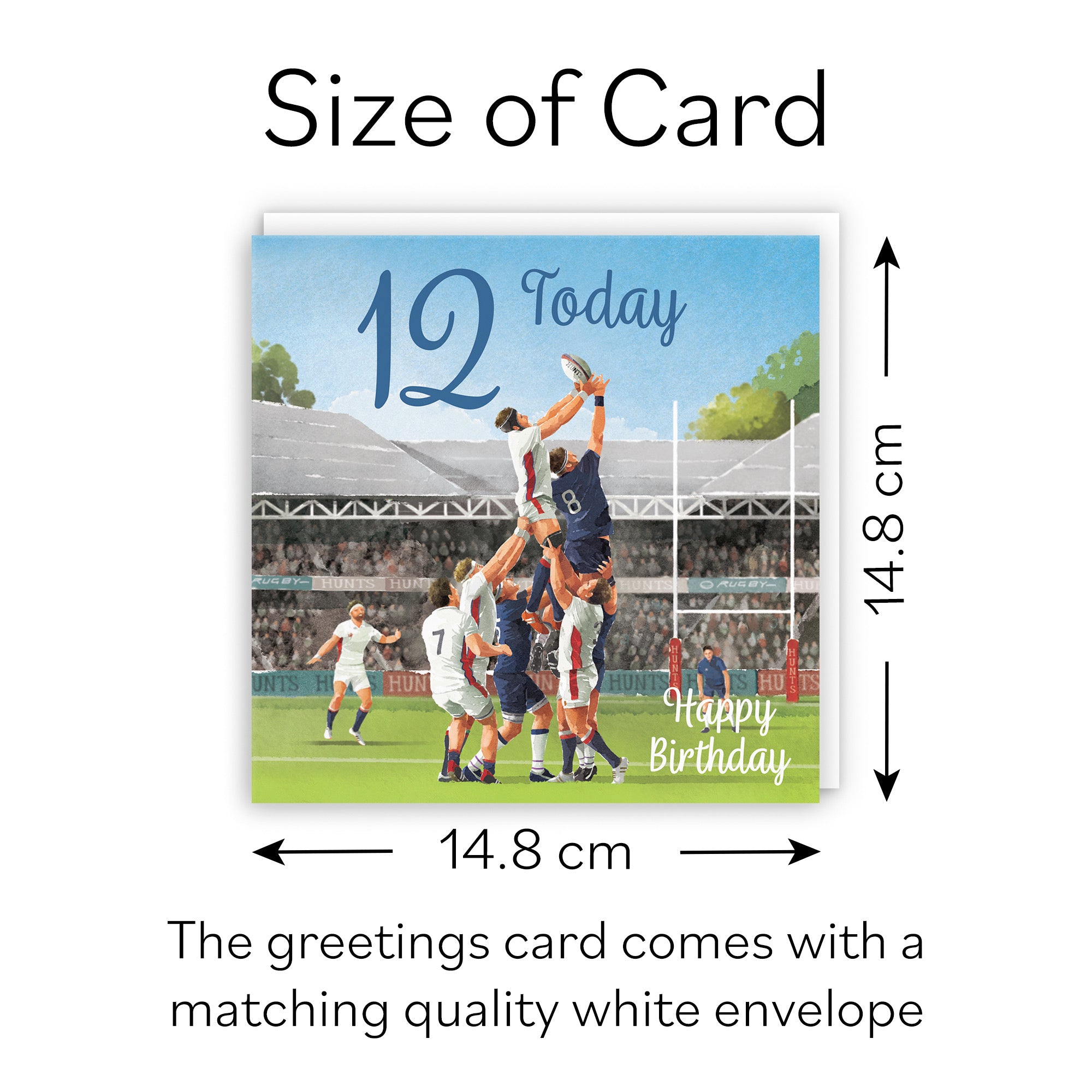 CARD MEASURES 14.8 x 14.8 cm - The rugby greetings card is printed on medium-weight paper stock. The card also comes with a white envelope which measures 15.5 x 15.5 cm.