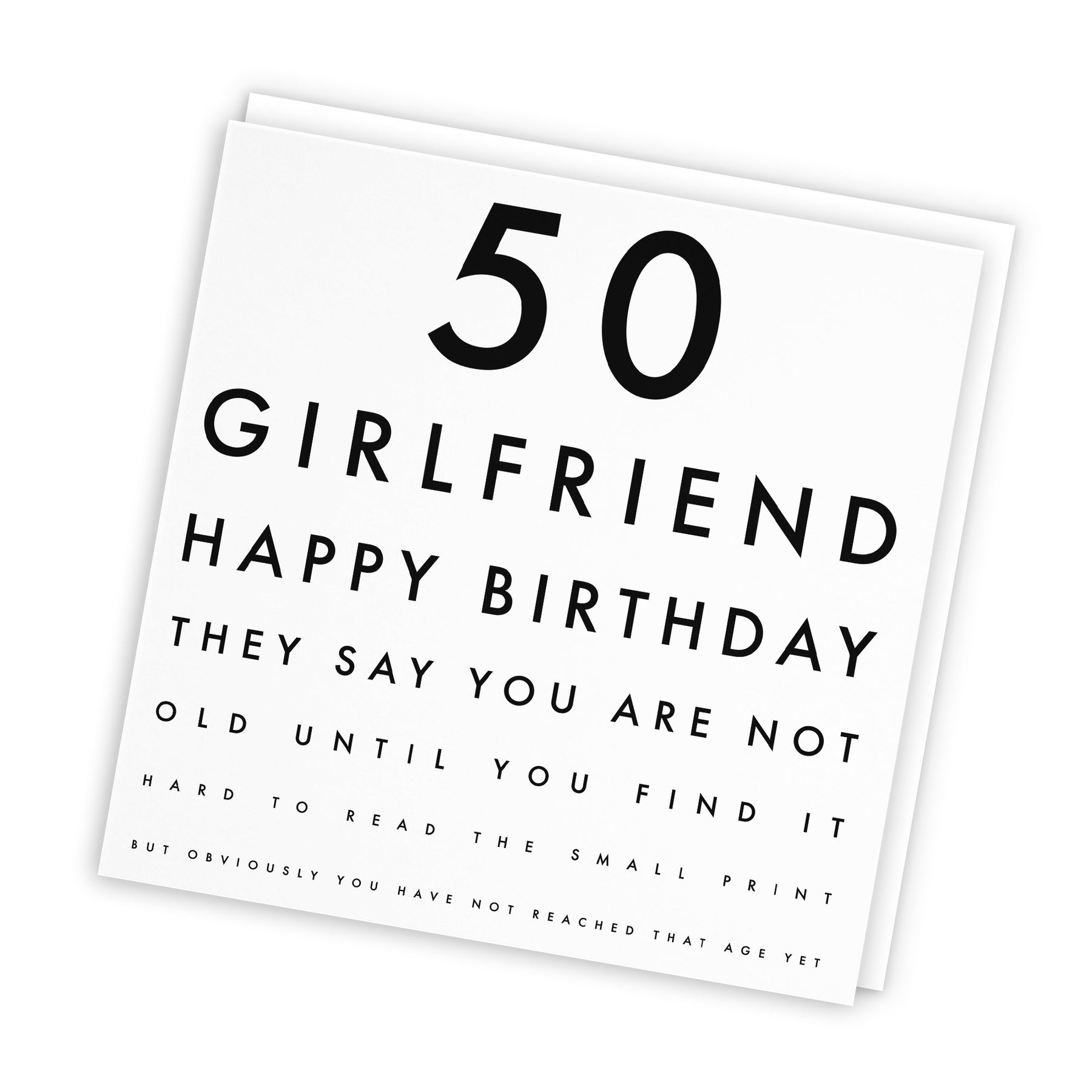 Hunts England - Girlfriend 50th Humorous Birthday Card - 50 Girlfriend - Happy Birthday - They Say You Are Not Old Until You Find It Hard To Read The Small Print... - Letters Collection.