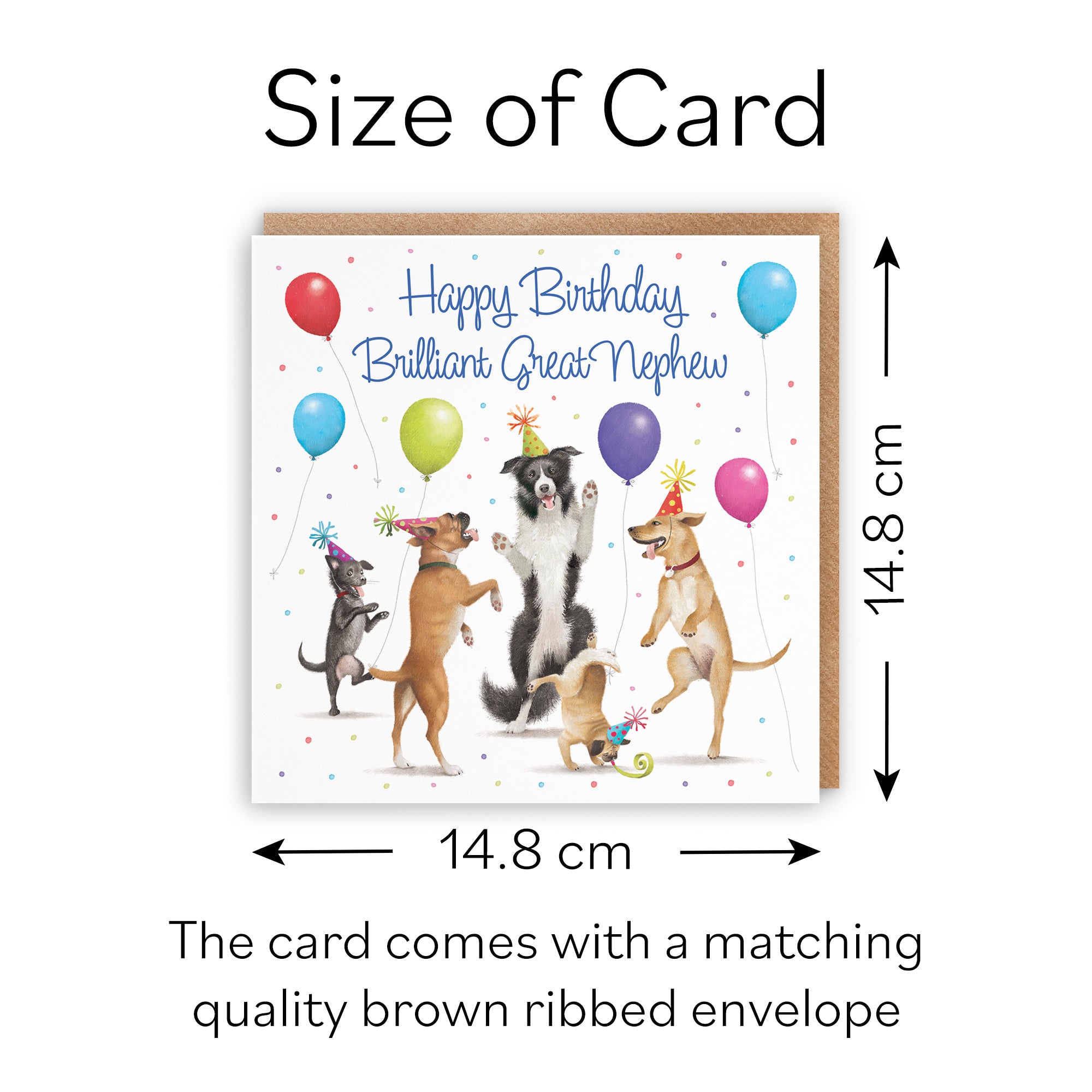 CARD MEASURES 14.8 x 14.8 cm - The greetings card is printed on medium-weight paper stock. The card also comes with a brown ribbed envelope which measures 15.5 x 15.5 cm.