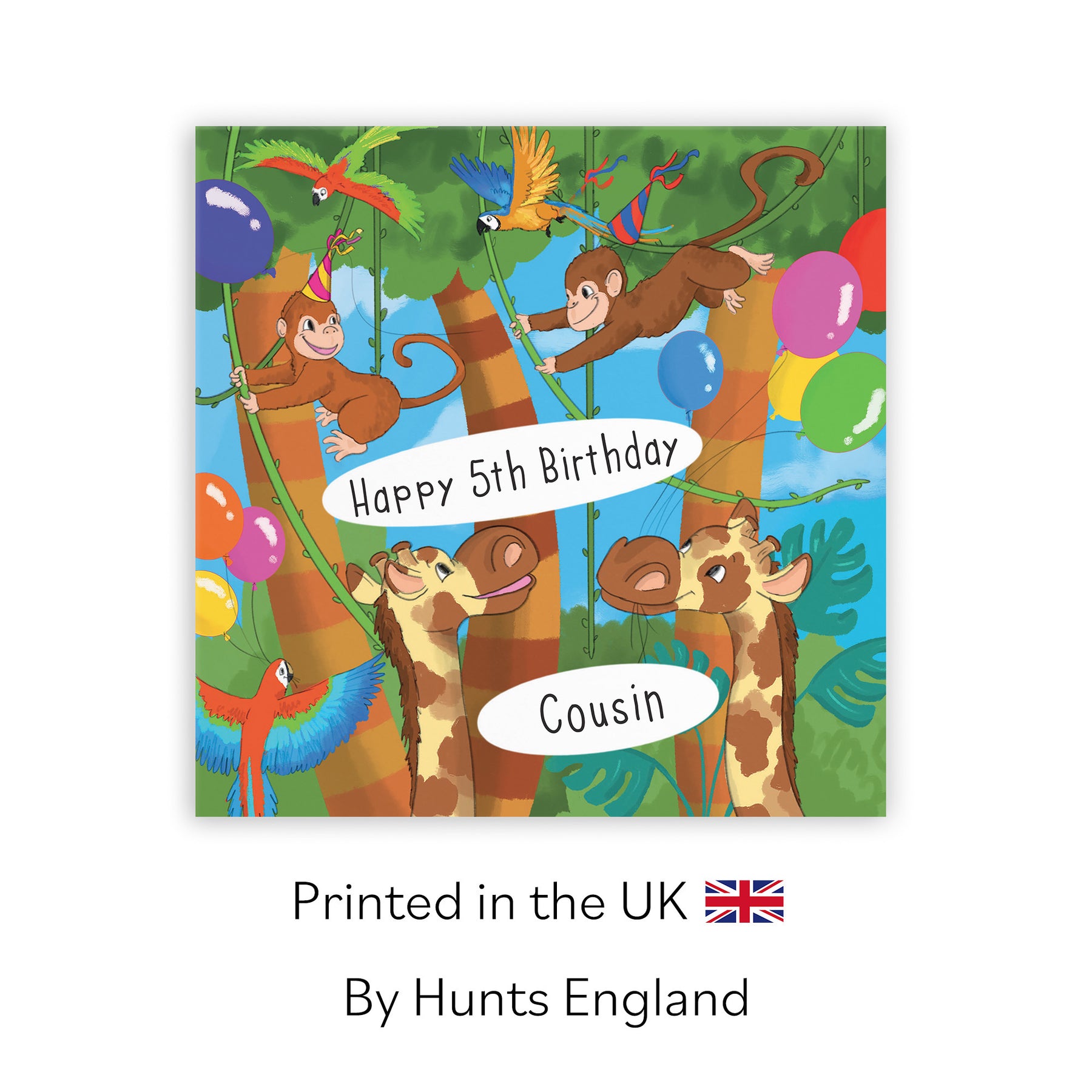 Hunts England - Cousin 5th Monkey Birthday Card - Happy 5th Birthday - Cousin - Monkeys, Giraffes & Parrots Kids Card - Jungle Collection.