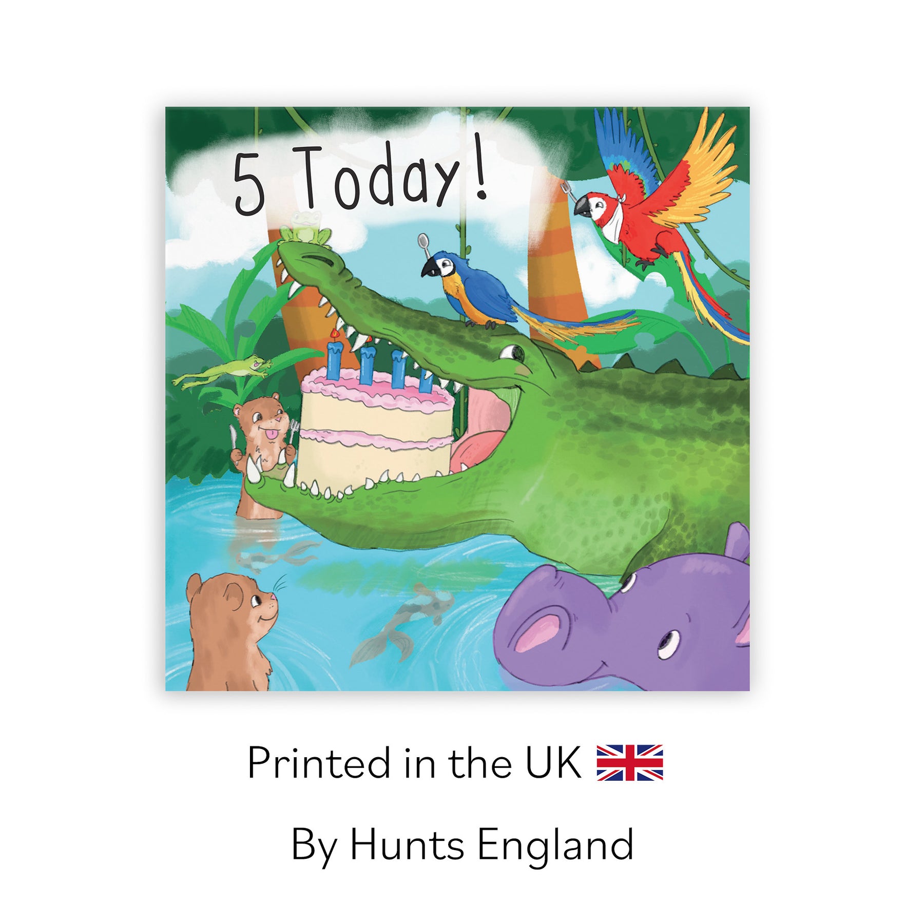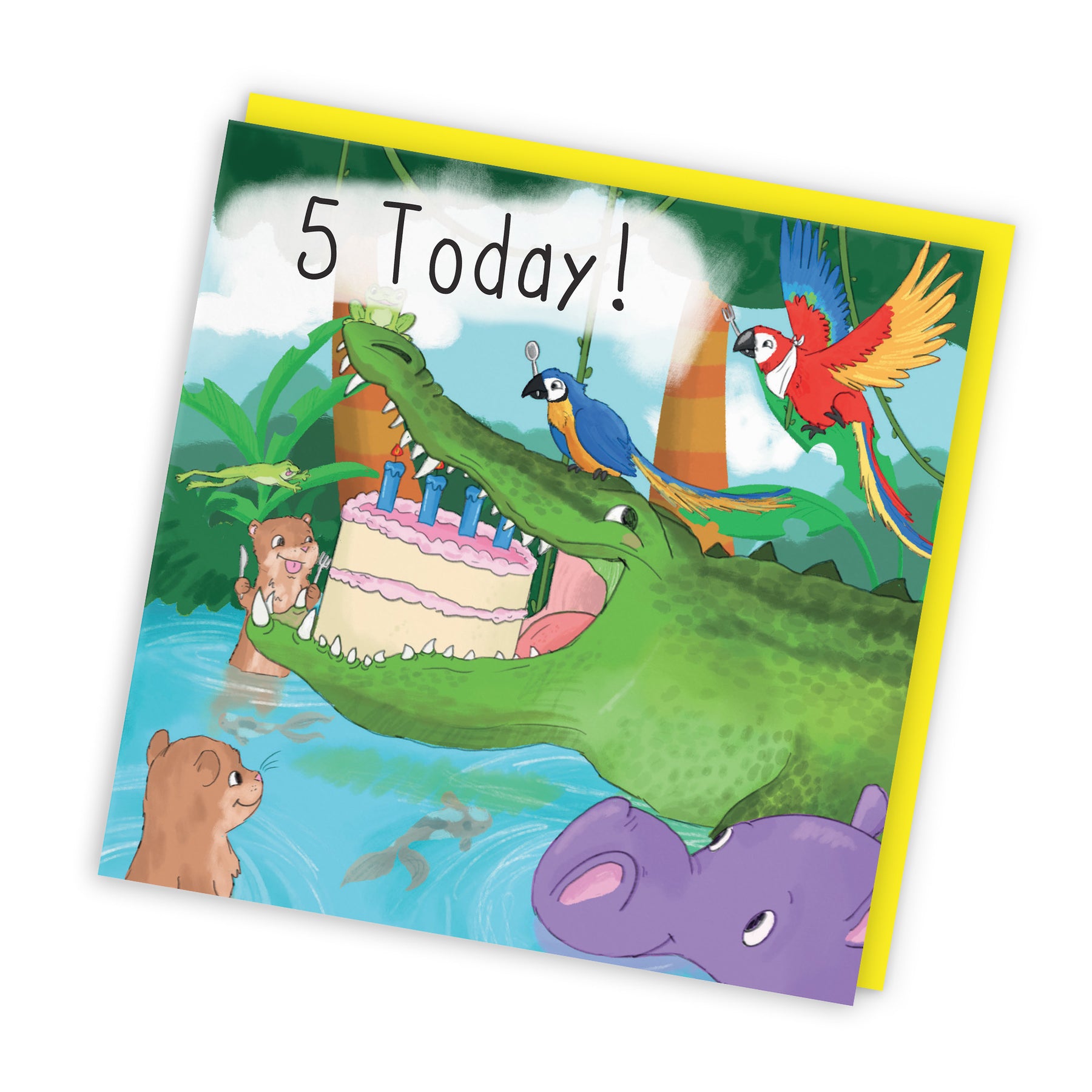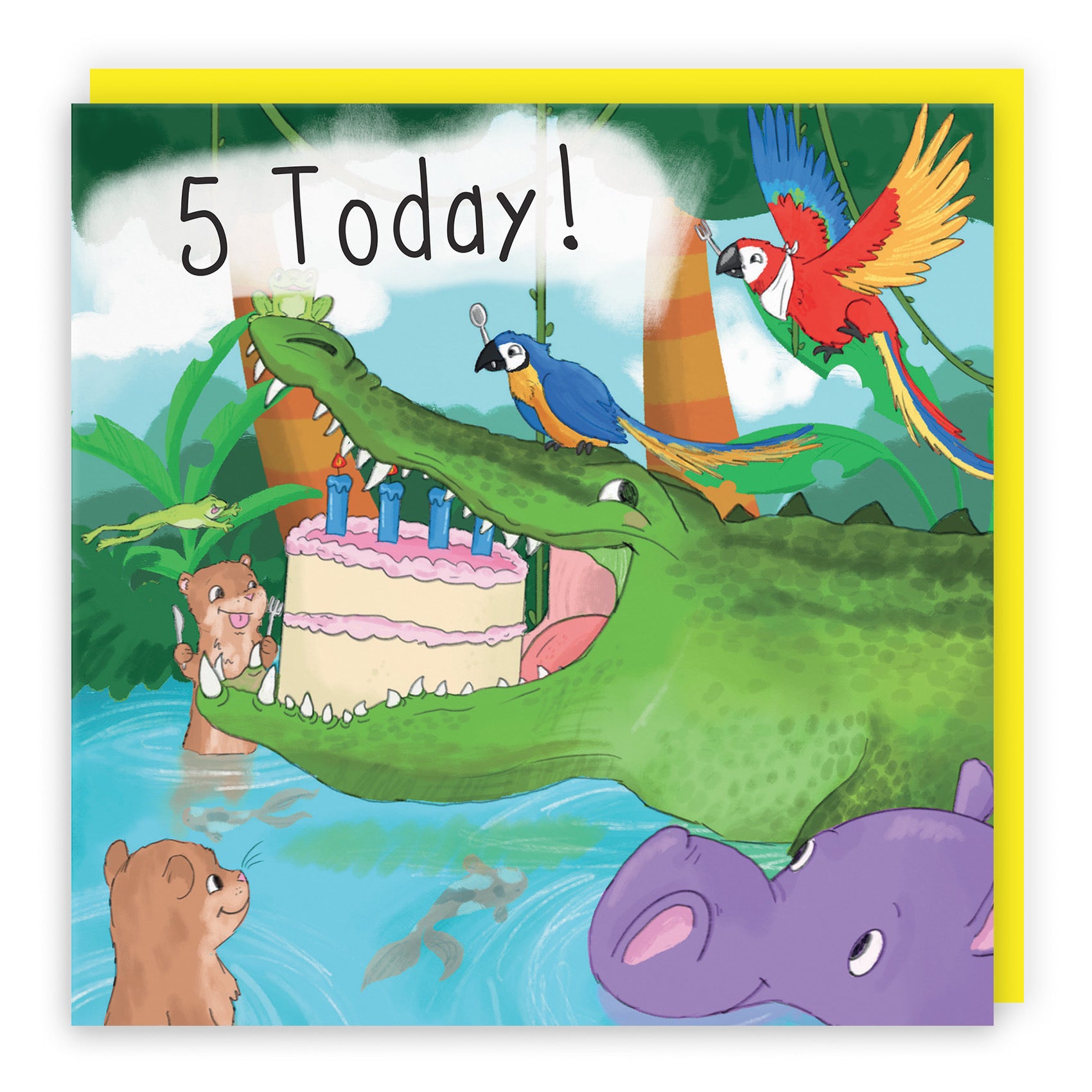 Hunts England - Crocodile 5th Birthday Card - 5 Today! - Funny Crocodile Eating Cake - Boys / Girls - Kids Birthday Card - Jungle Collection.