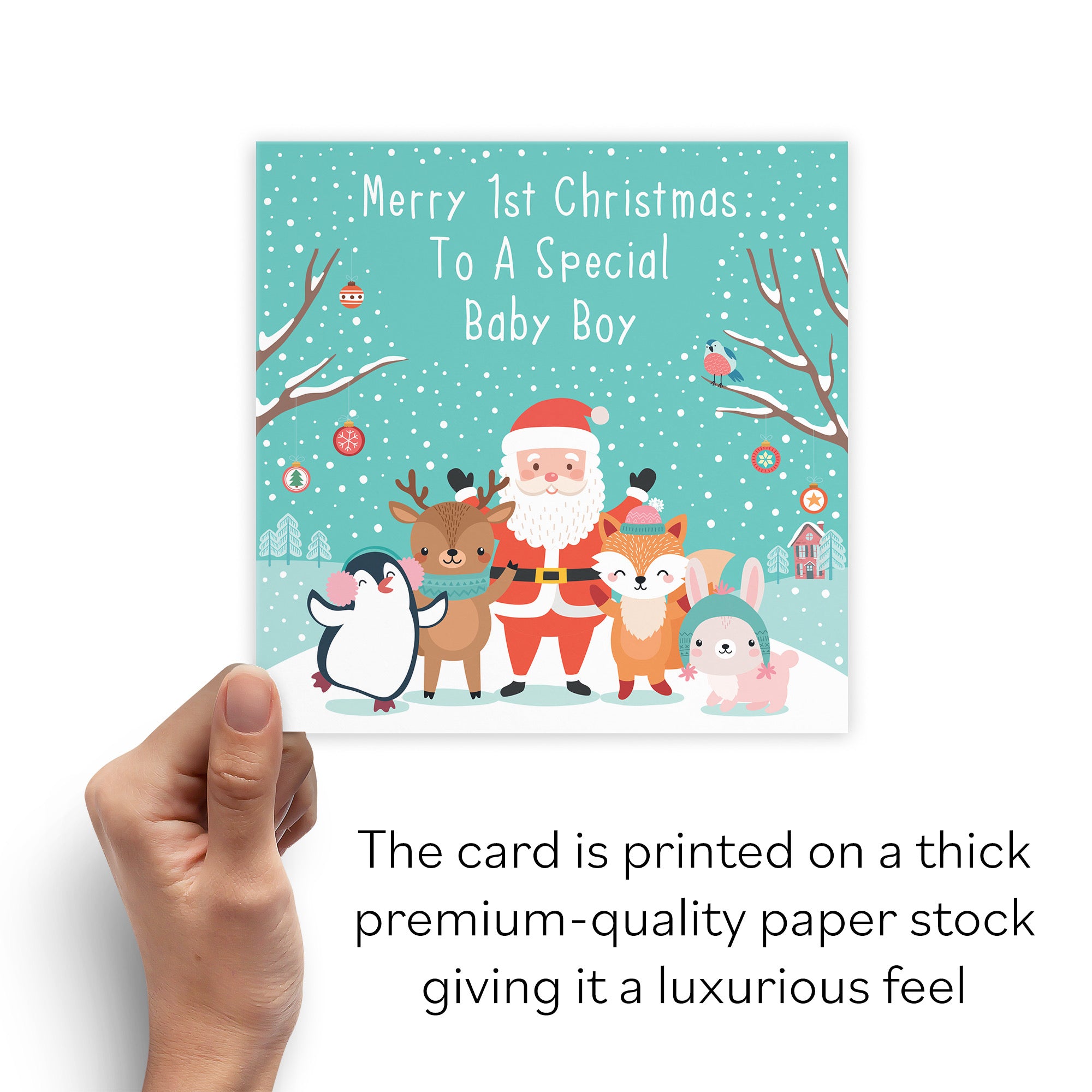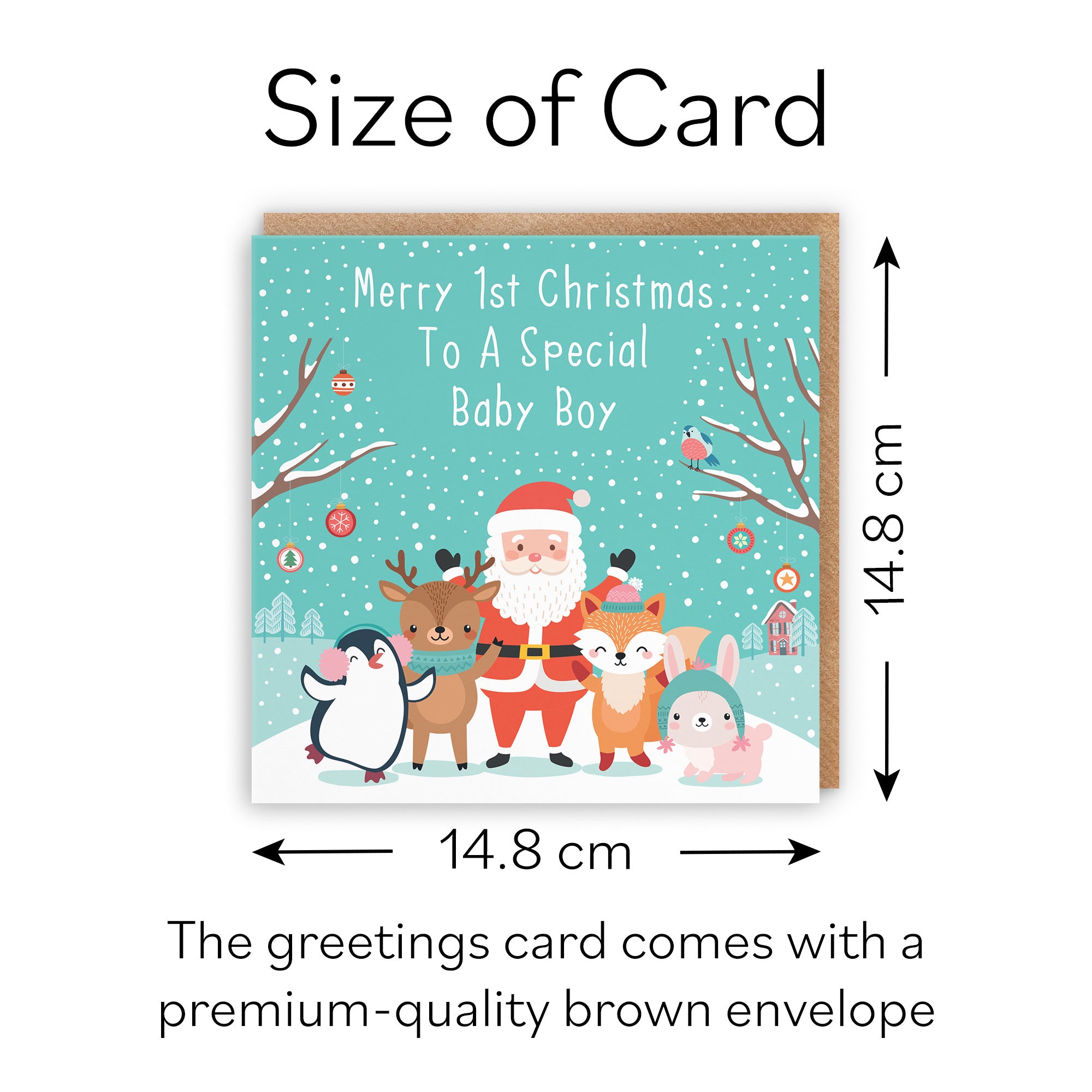 CARD MEASURES 14.8 x 14.8 cm - The greetings card is printed on medium-weight paper stock and comes with an envelope which measures 15.5 x 15.5 cm.