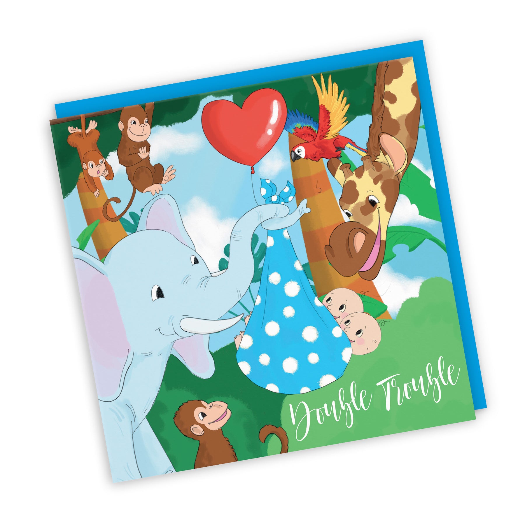 Hunts England - New Baby Boy Twins Congratulations Card - Double Trouble - Elephant Holding New Baby Twins - For Mum To Be / Parents To Be - Two Boys - Jungle Collection.