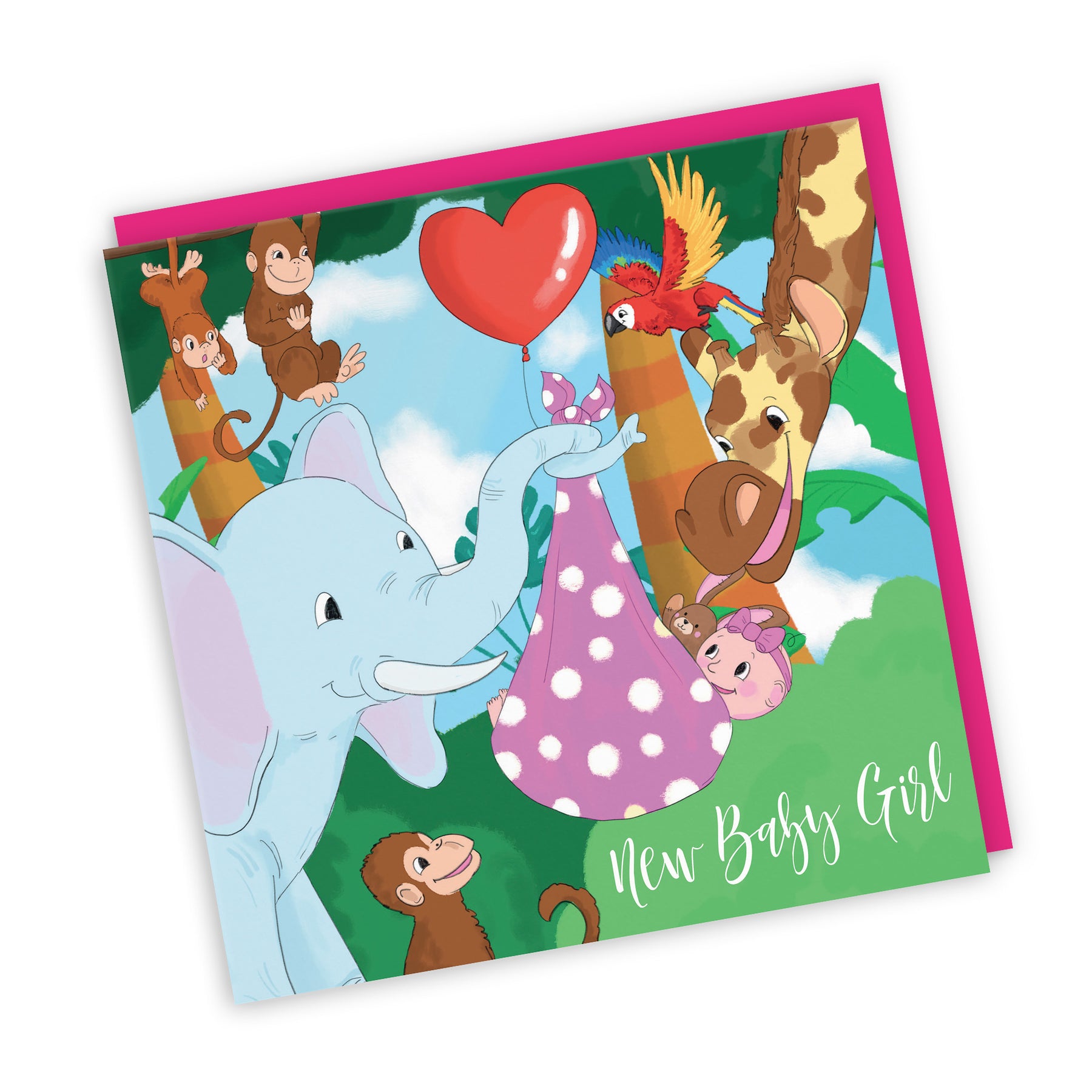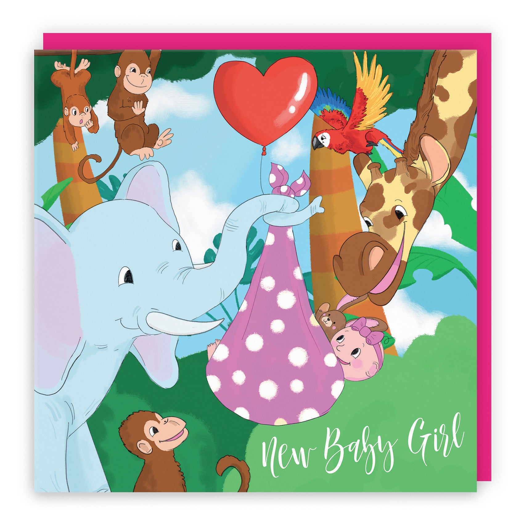 Hunts England - New Baby Girl Congratulations Card - Cute Elephant Holding New Baby - Pink - For Mum To Be / Parents To Be - Newborn - Jungle Collection.