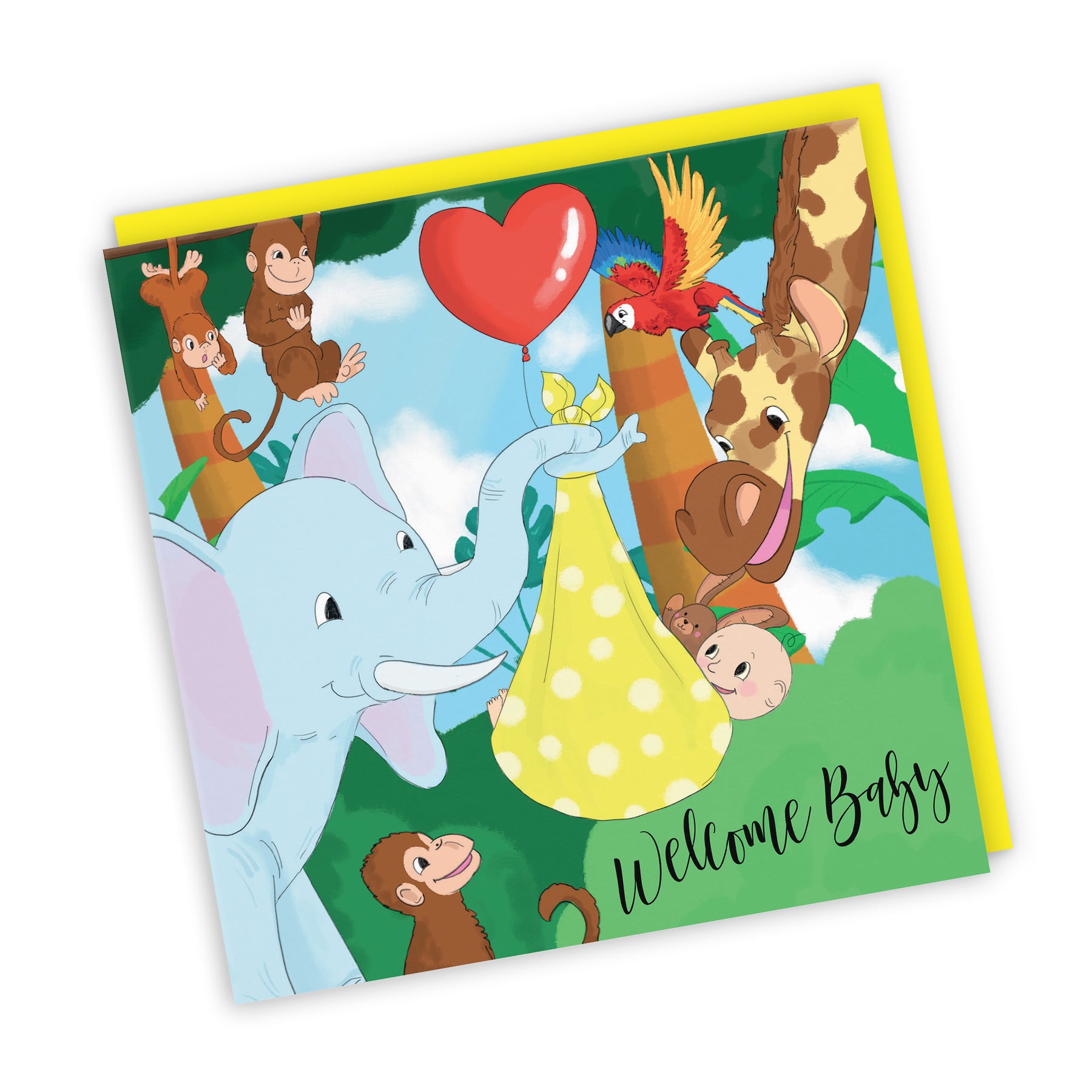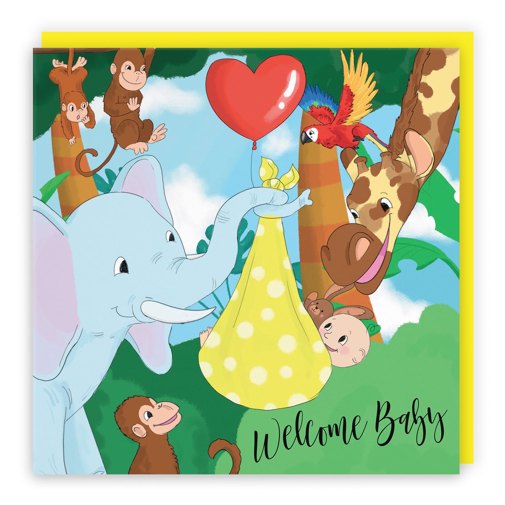 Hunts England - Welcome Baby Congratulations Card - Cute Elephant Holding New Baby - Yellow - For Mum To Be / Parents To Be - Newborn - Boy / Girl - Jungle Collection.