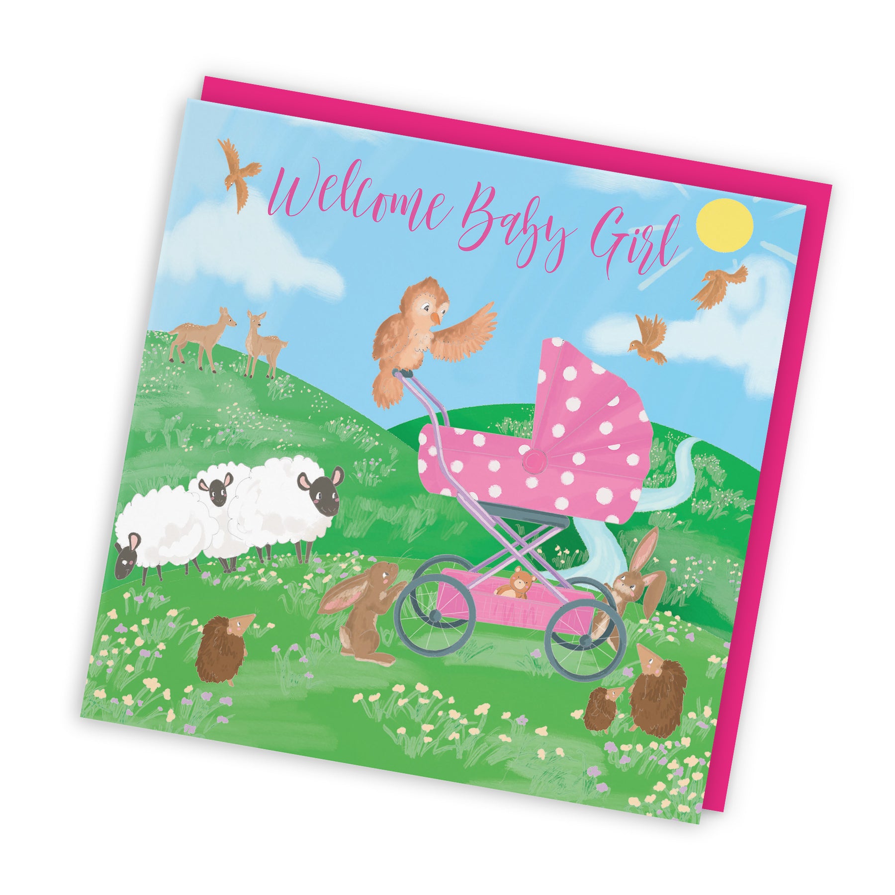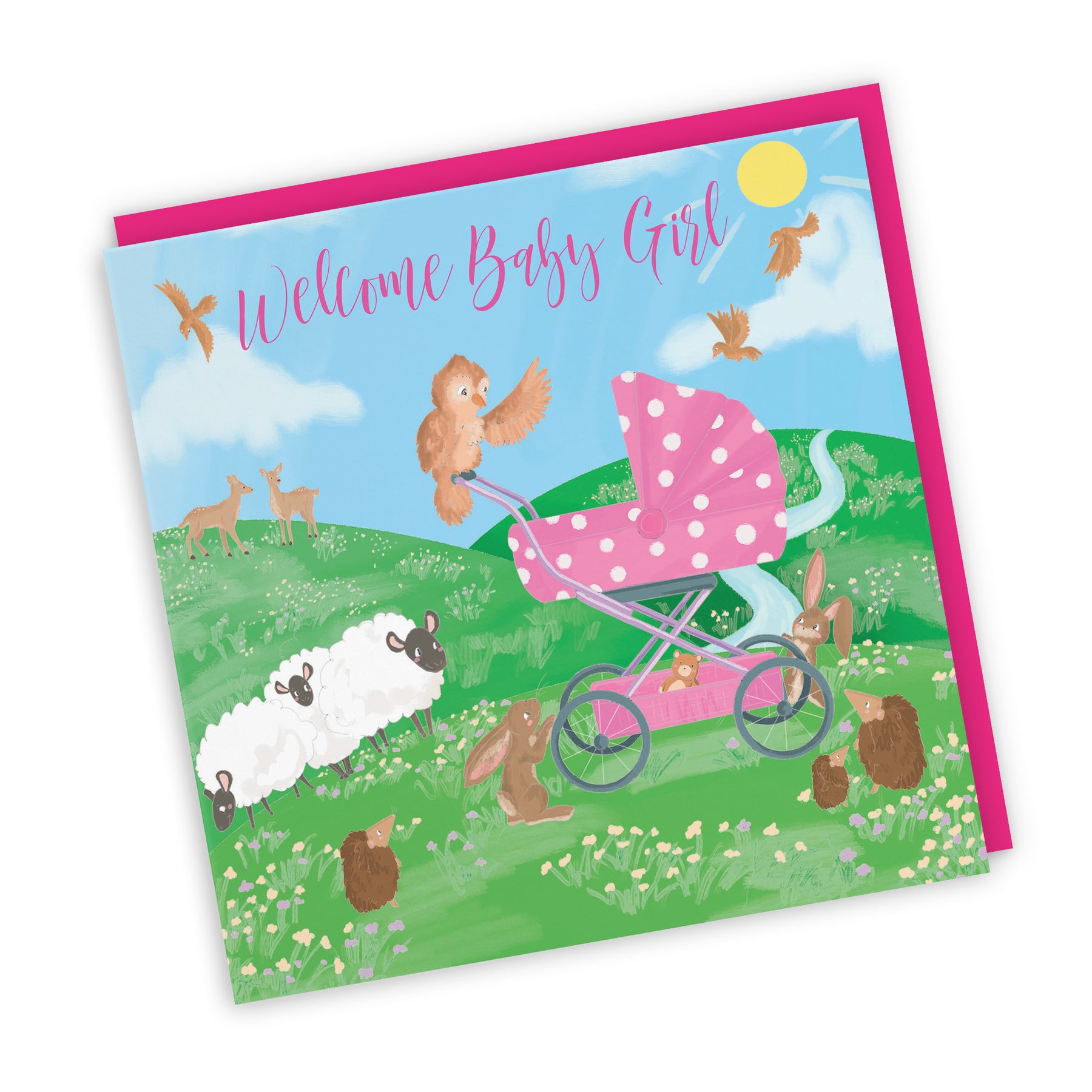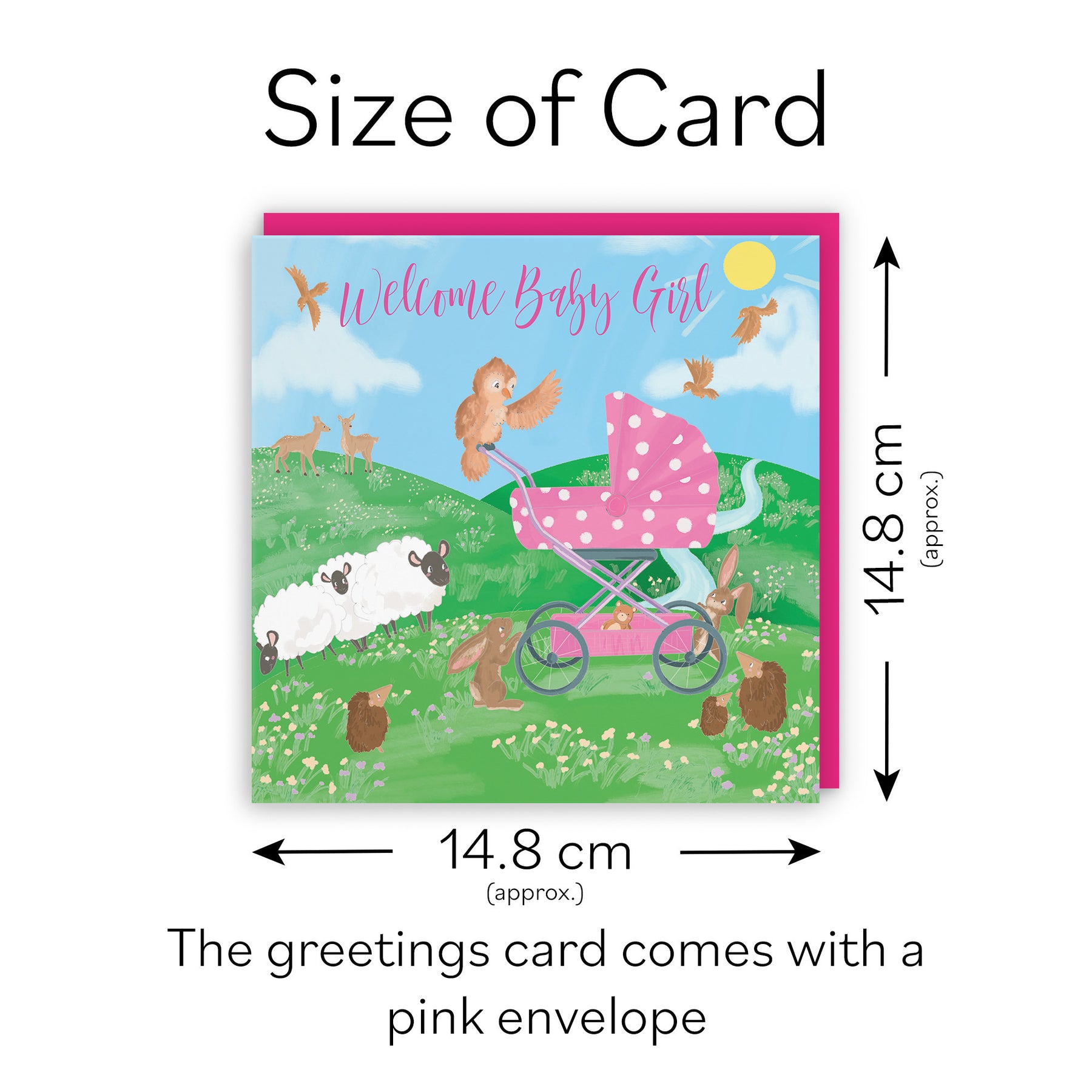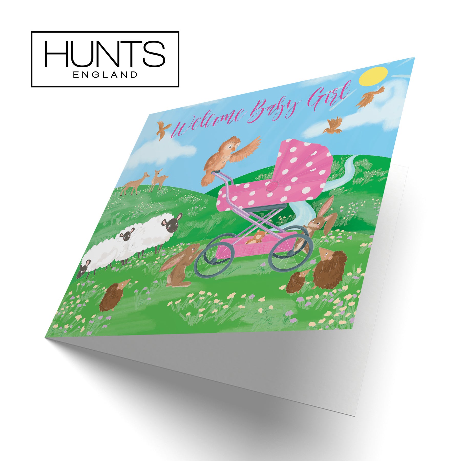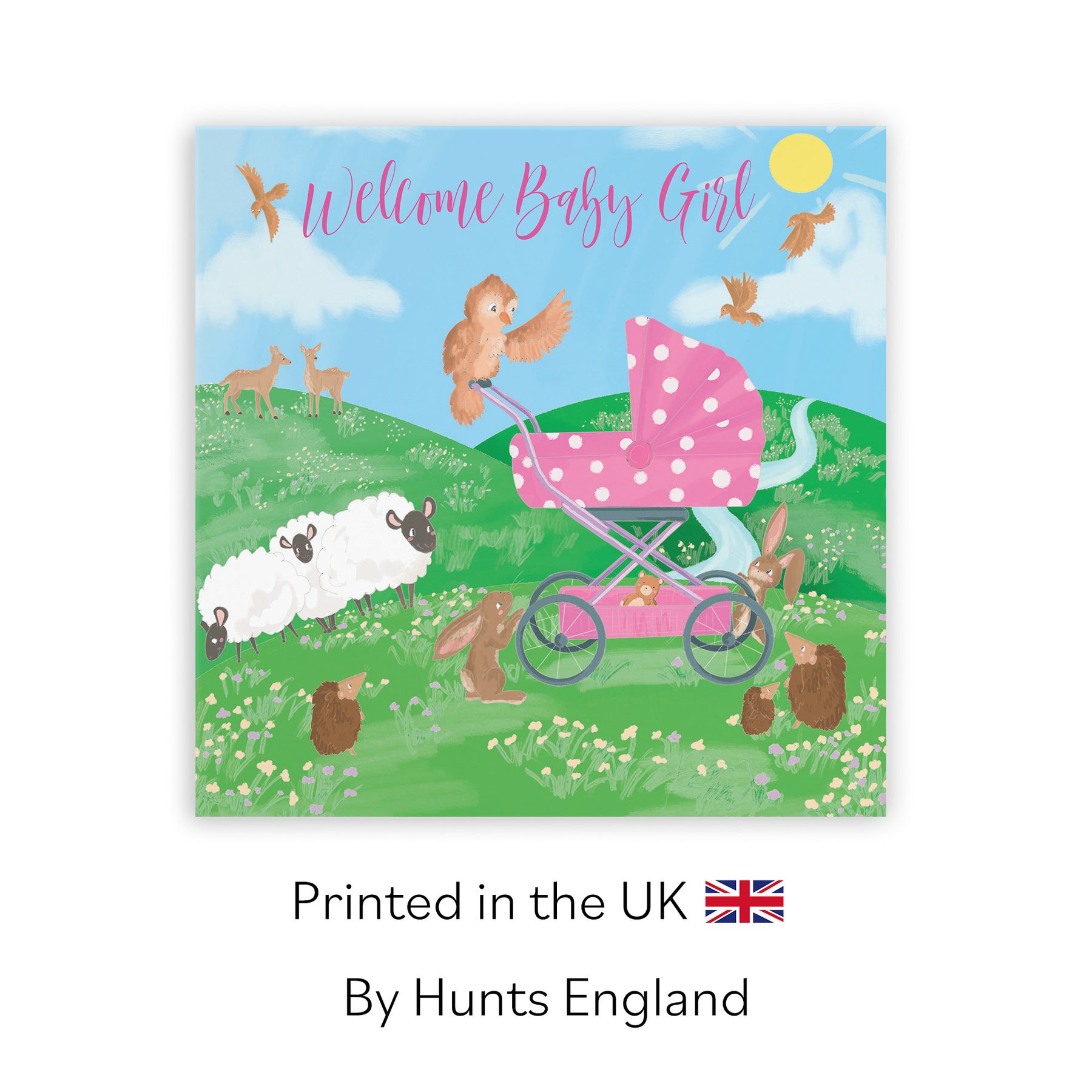 Hunts England - Welcome Baby Girl Congratulations Card - Cute New Baby Card - For Mum To Be / Parents To Be - Newborn - Girl - Pink Pram - Countryside Collection.