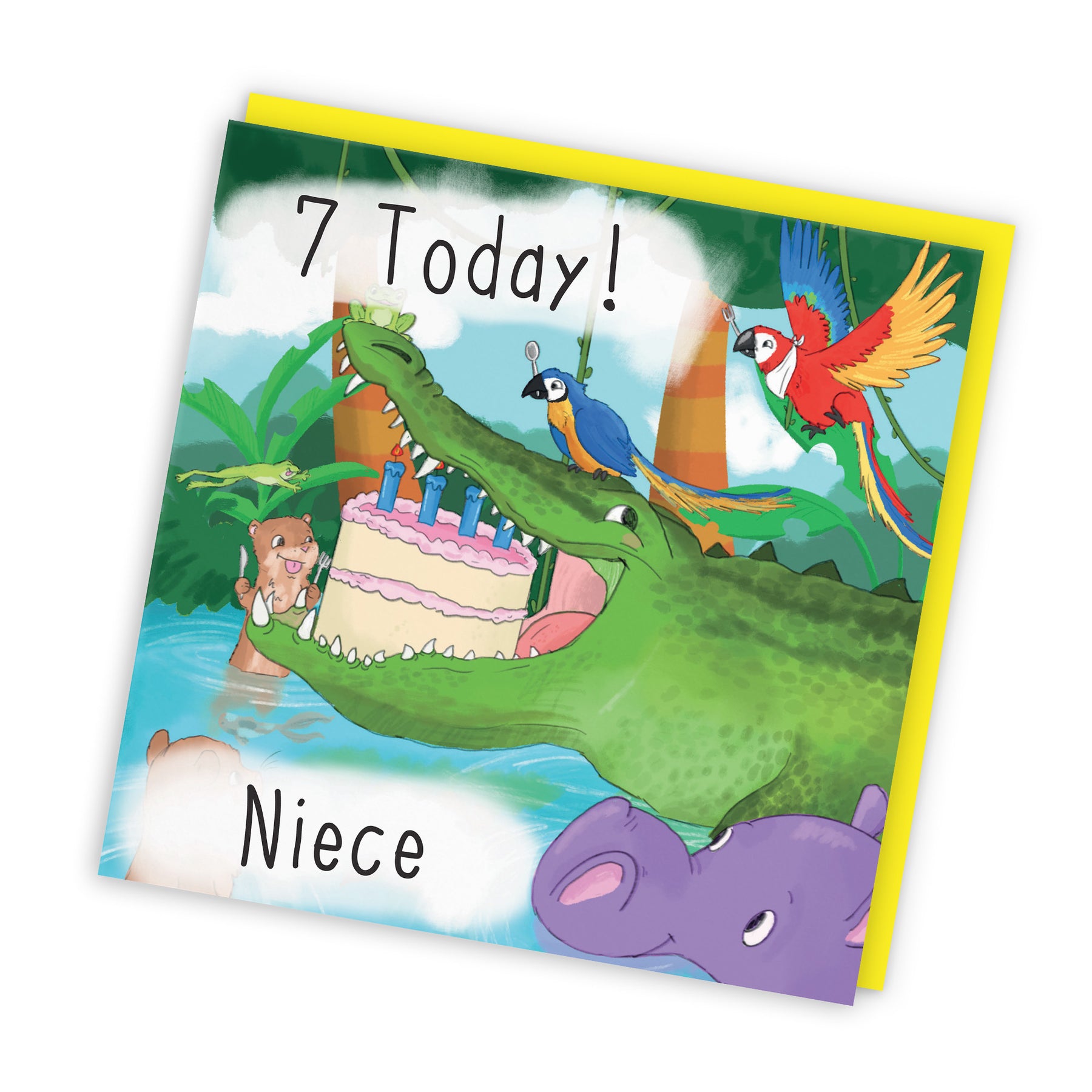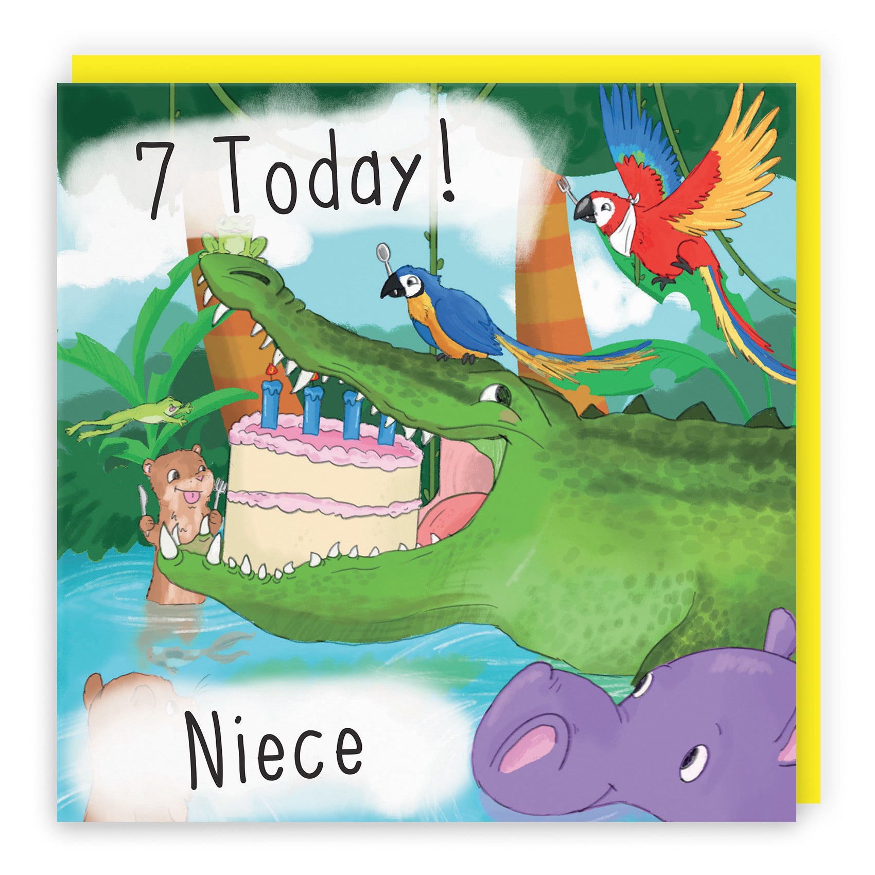 Hunts England - Niece 7th Crocodile Birthday Card - 7 Today! - Niece - Funny Crocodile Eating Cake - Kids Birthday Card - Jungle Collection.