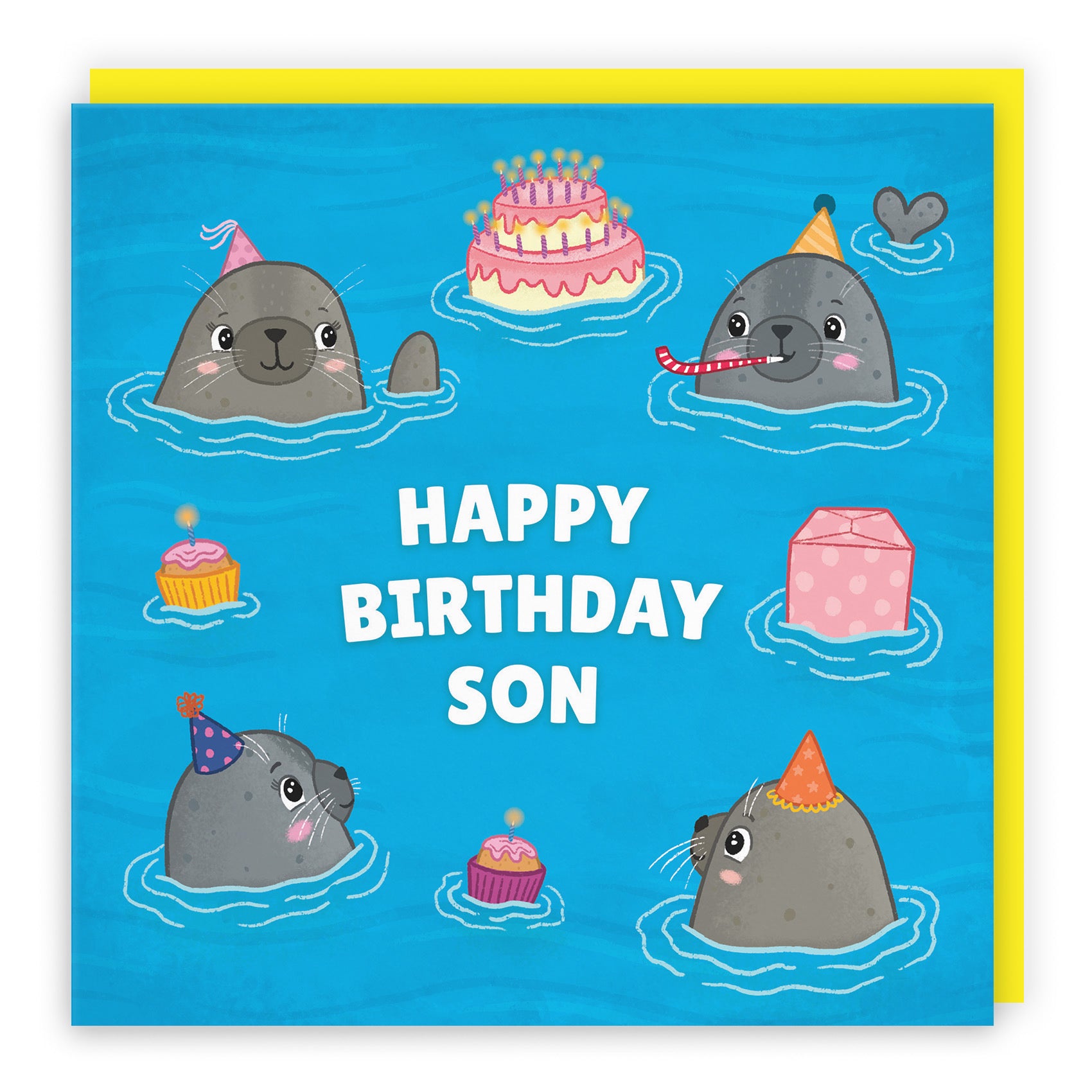 Hunts England - Son Cute Seals Birthday Card - Happy Birthday - Son - Children's / Kids Card - Seals At A Party - Ocean Collection.