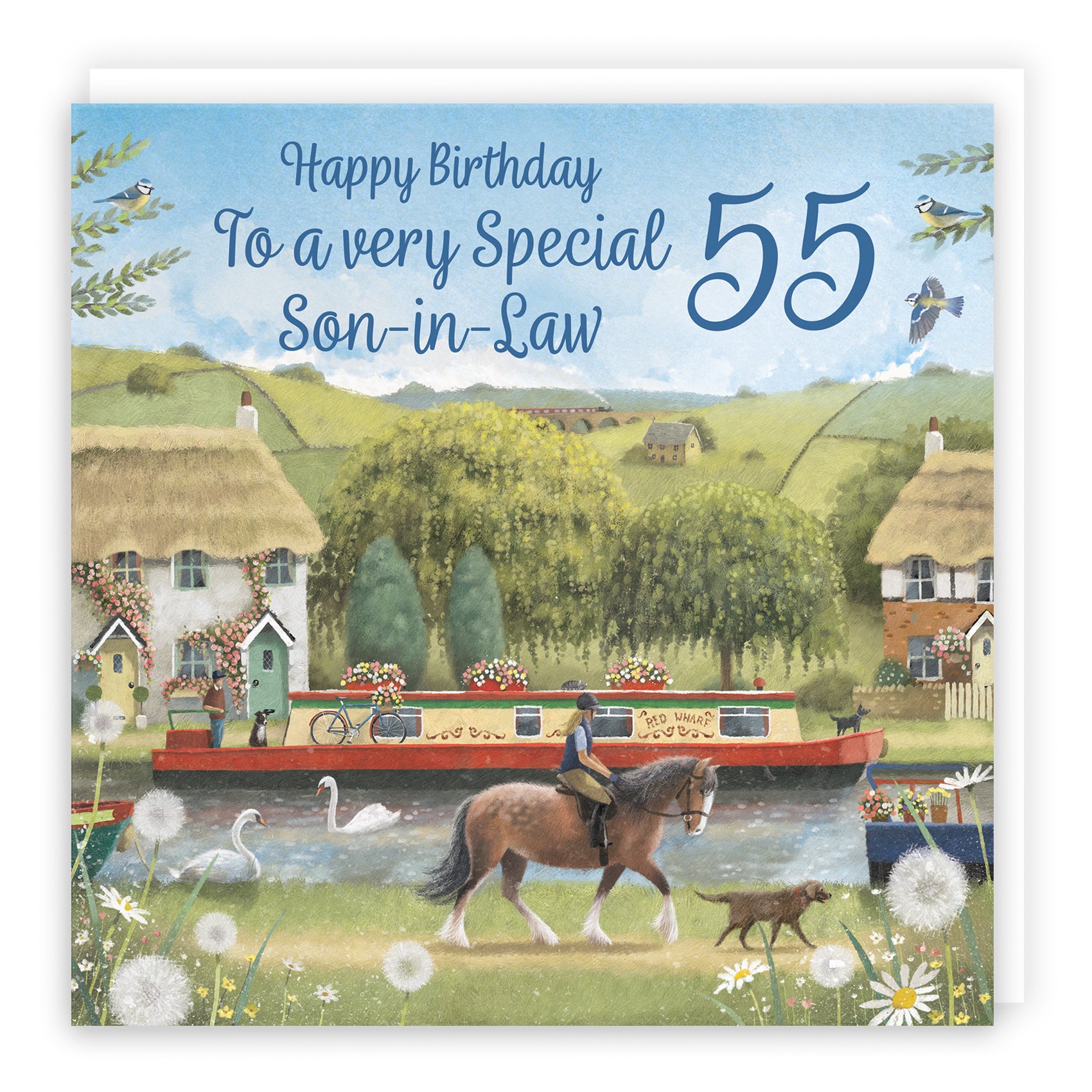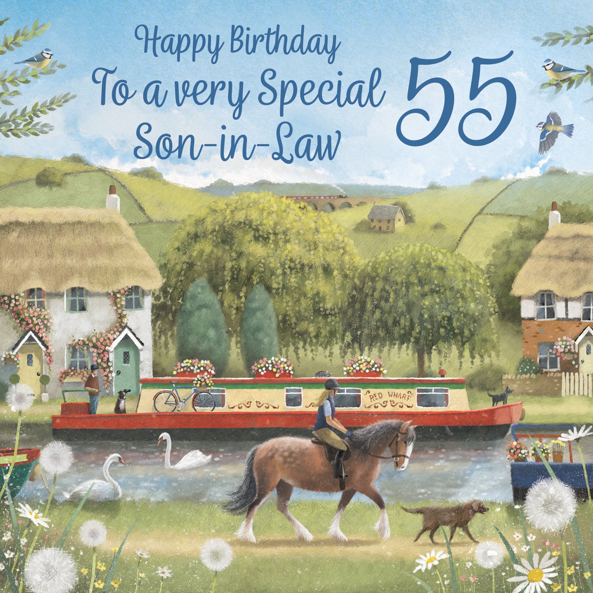 55th Son-in-Law Canal Narrowboat Birthday Card - Horse Riding - Countryside - Age 55 Card For Son-in-Law - Milo's Gallery - Age Fifty Five Birthday Card - Son In Law Birthday.