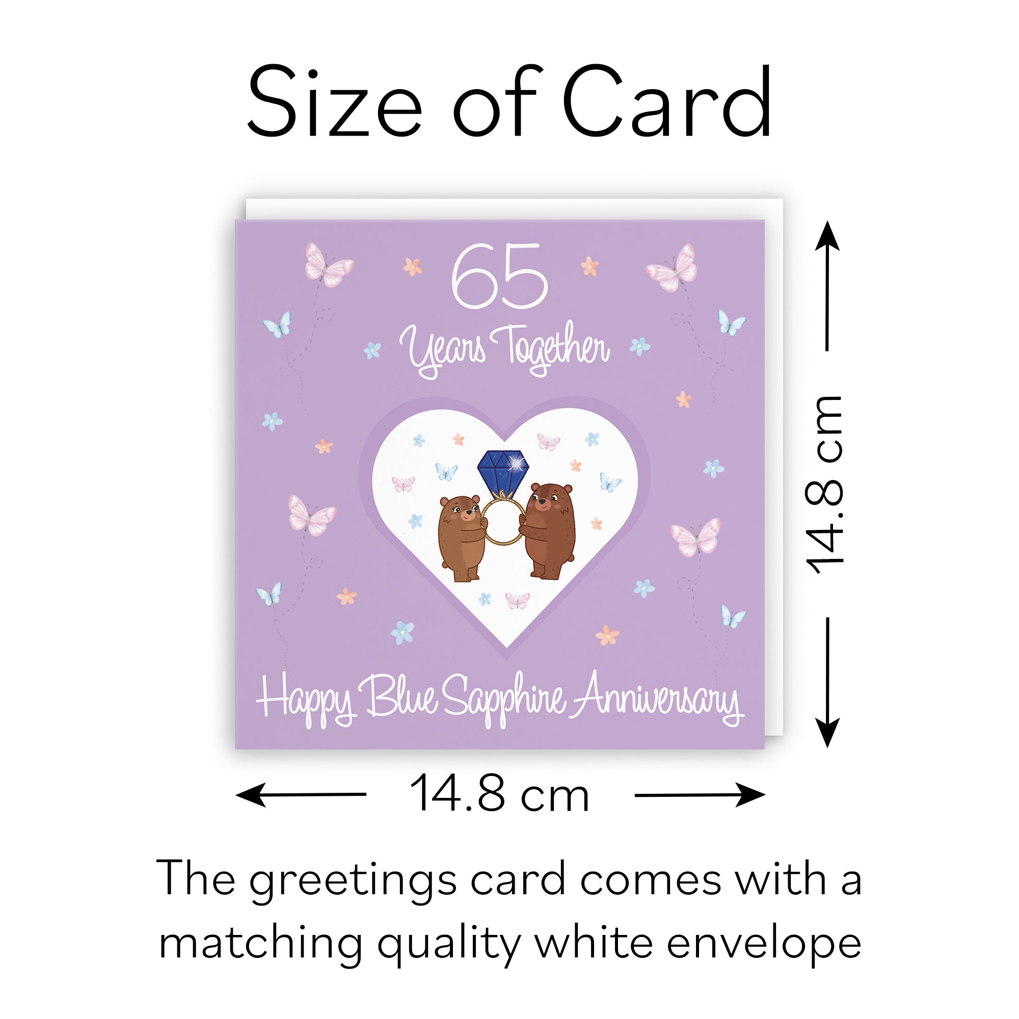Our contemporary anniversary card measures 148 x 148 mm and is printed on medium-weight paper stock. The card also comes with a white envelope which measures 155 x 155 mm in size.