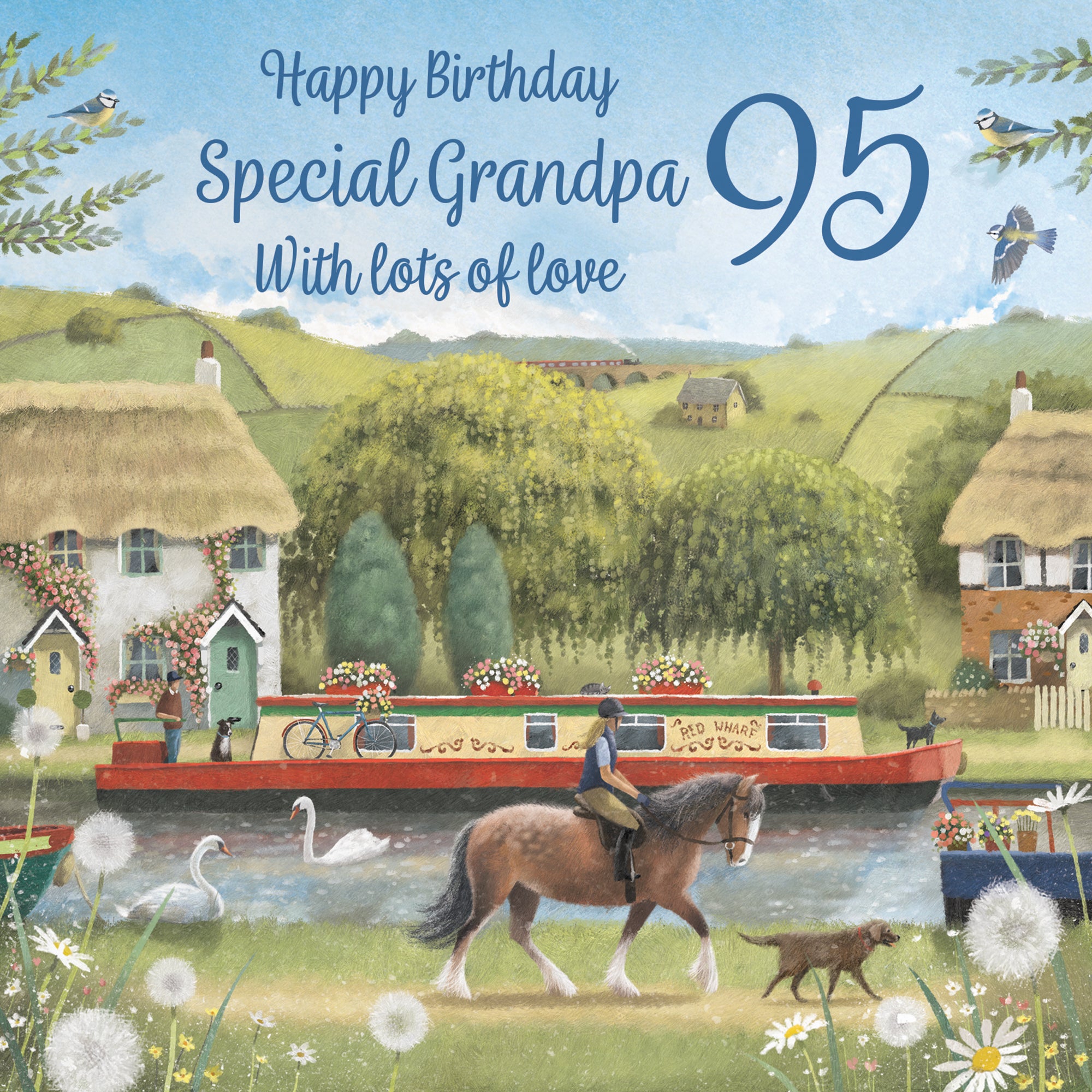 95th Grandpa Canal Narrowboat Birthday Card - Horse Riding - Countryside - Age 95 Card For Grandpa - Milo's Gallery - Age Ninety Five Birthday Card - Grandpa Birthday.