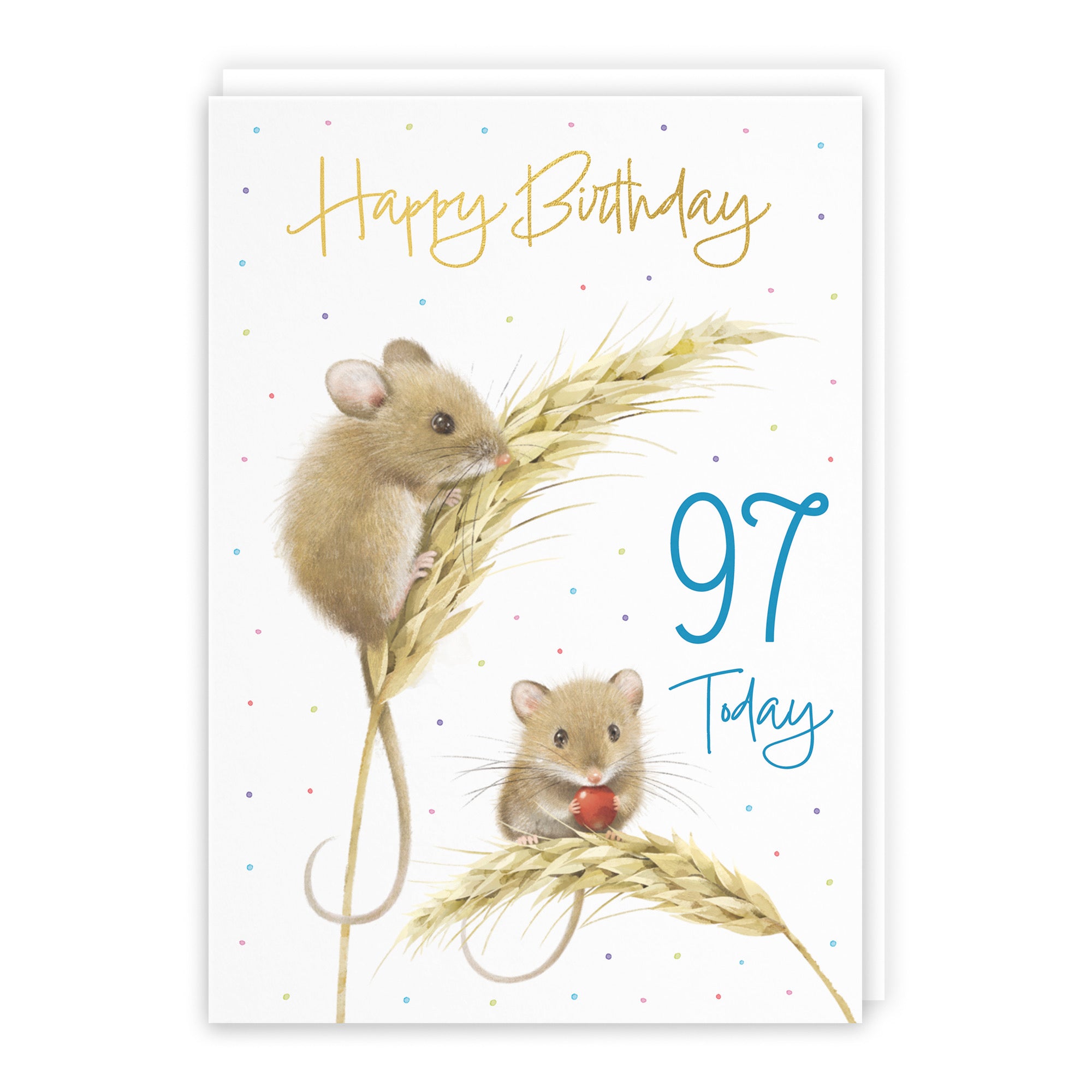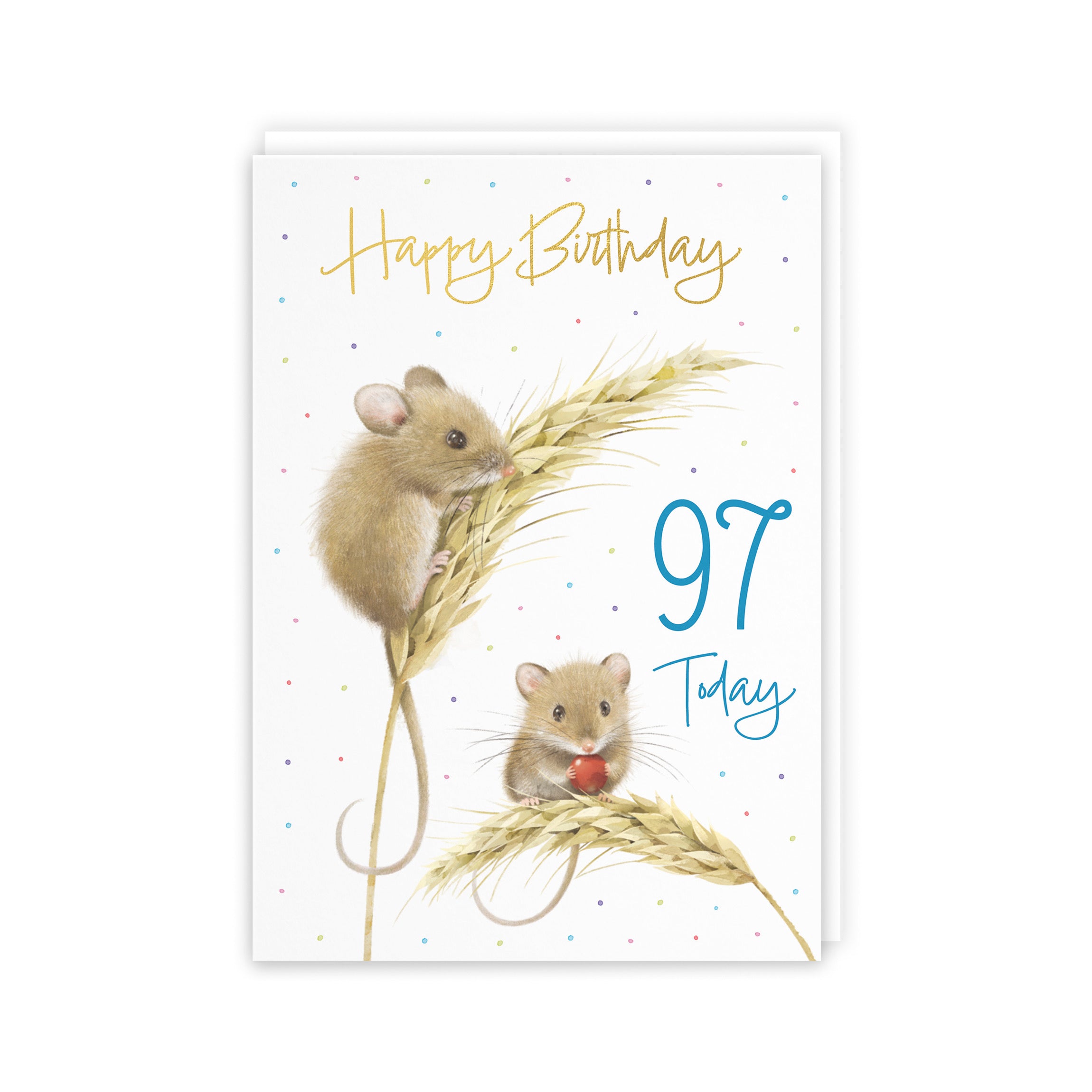 Hunts England - Harvest Mice Male 97th Gold Foil Birthday Card For Him - Blue - A5 Size - Mouse On Wheat, Colourful Nature Design - Age 97 Happy Birthday Card - Milo's Gallery.
